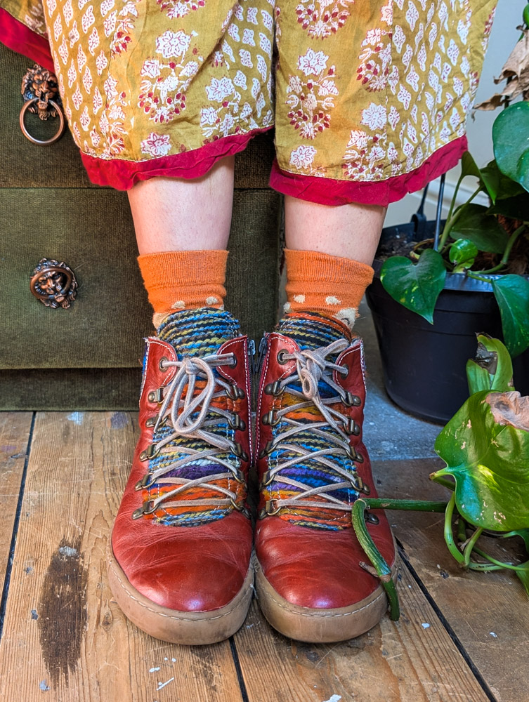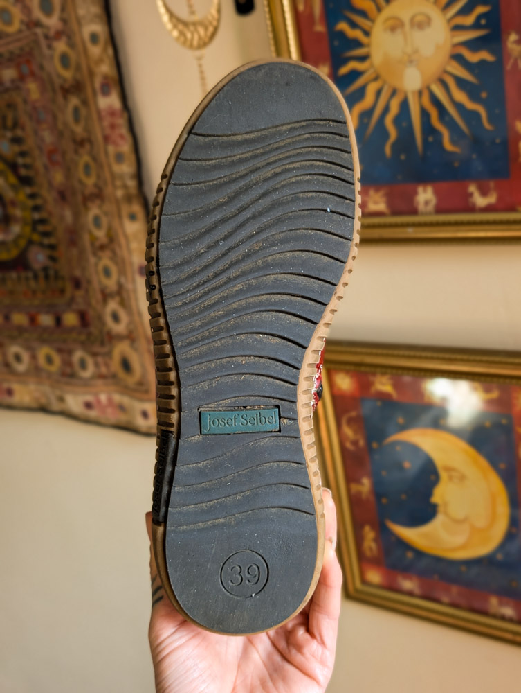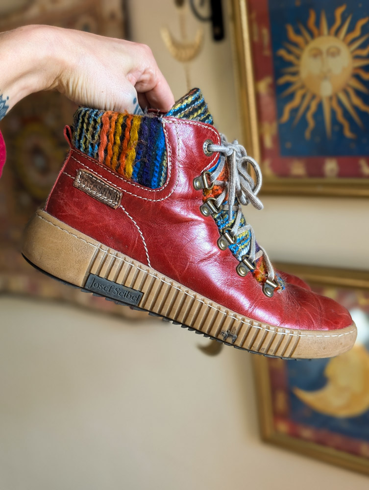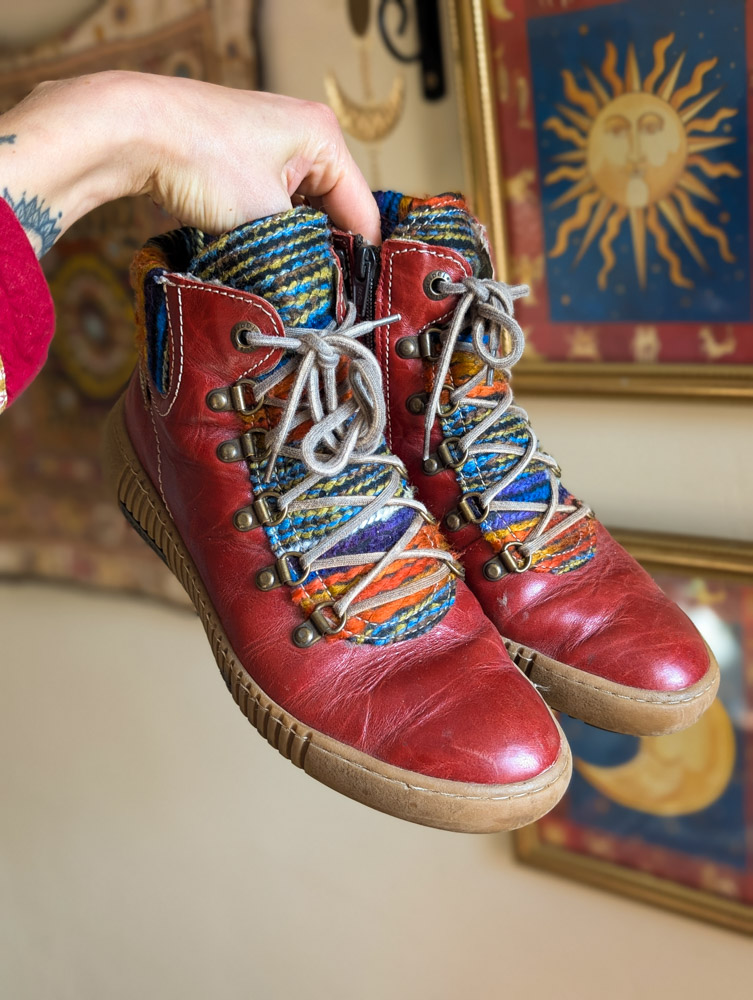 Preloved red leather boots by Joseph Seibel (RRP £100) with woven tapestry detail. Zip-up the side, comfy fit and barely used condition.