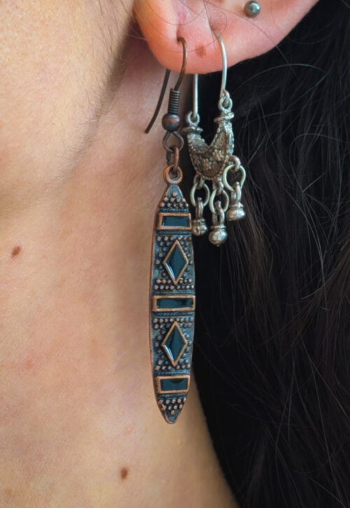 These are just divine! Short dungarees made from beautiful vintage Indian block printed cotton. A soft apple green on the front and complimentary lilac on the back, with a white stitch running all the way through. Look out for the hint of bright pink stitching too. These have one large button to fasten the straps (which could be moved and resewn to adjust), front pockets and belt loops. The straps have been shortened a little by the previous owner and could be let out to give another 1″ on the straps. These are in good condition with a little sign of wear, as to be expected from something upcycled.