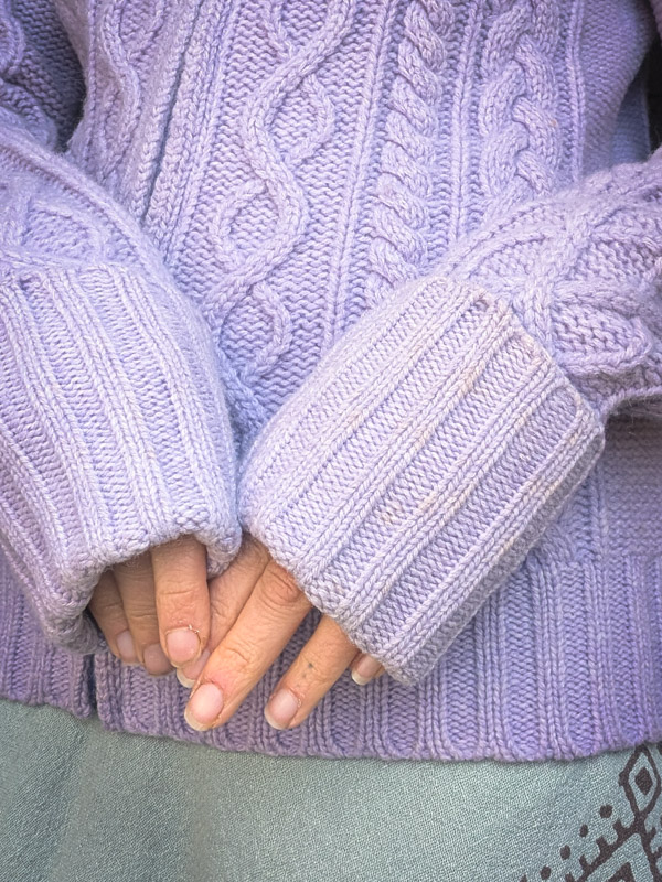 Zip-up cardigan from Y2K Gap in a sweet lilac cable knit. This is wool yet isn’t too heavy to wear and feels lovely against the skin (if you’re sensitive of course layer underneath but for Sarah it felt ok)/
