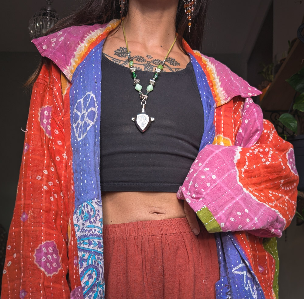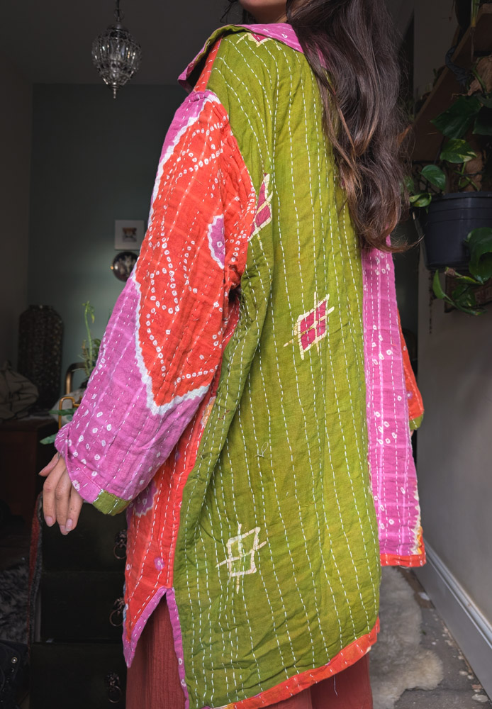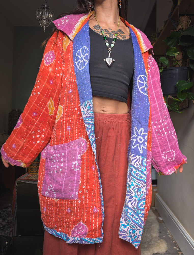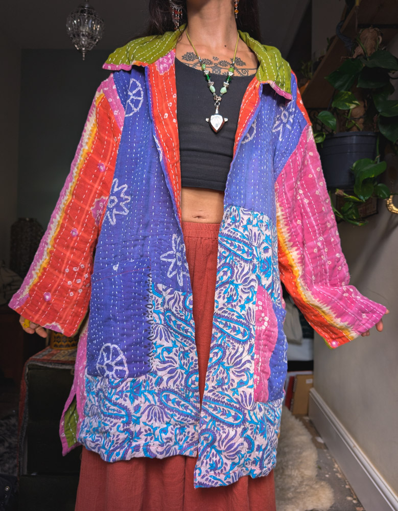 Made from two fine layers of recycled Indian, printed cotton with a white kantha stitch running through it. Relaxed fit with a collar, two pockets on each side and long, full sleeves. The seams are left overlocked for a more bohemian feel. Because this is made from vintage materials, please expect a couple of gentle signs of wear such as tiny holes or repair stitching.
