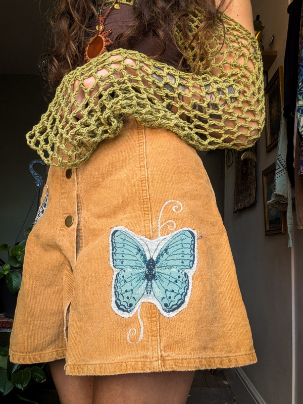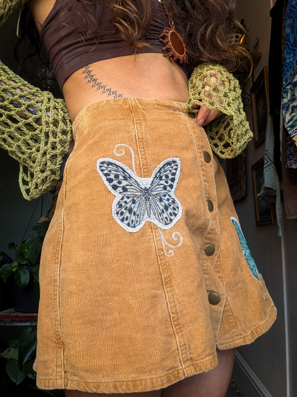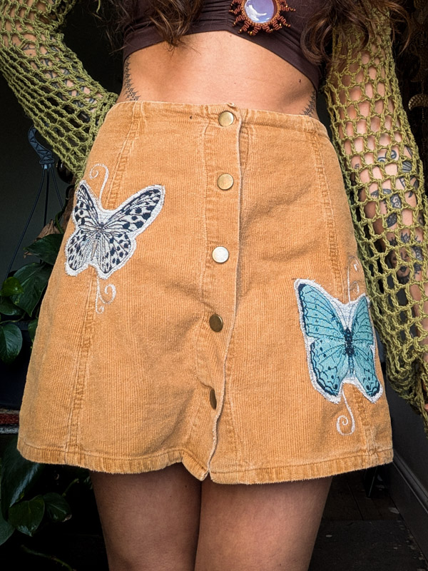 Preloved beige corduroy mini skirt, high waisted fit with poppers to fasten. Reworked on the front with tapestry woven butterflies taken from an old cushion cover, with a dash of embroidery for a whimsical piece.