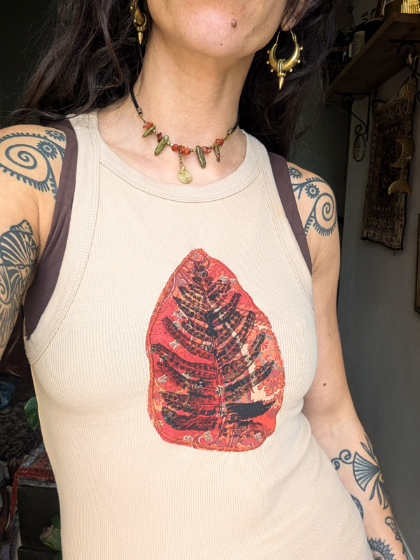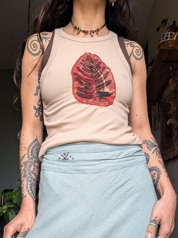 Preloved beige ribbed vest, round neckline, high back and long fit. Reworked with a big fern printed patch which was printed on vintage paisley fabric thrifted many years ago in France. This is perfectly machine washable following simple care instructions provided on a card on the garment.