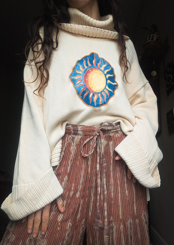 Thrifted cosy sweatshirt with a relaxed fit. This is from a fancy brand called Part Two and retails at over £100. Slouchy, big roll neck and fold up sleeves for an effortlessly stylish feel. Reworked with a vintage sun motif reclaimed from a piece of 90s fabric sourced from France.