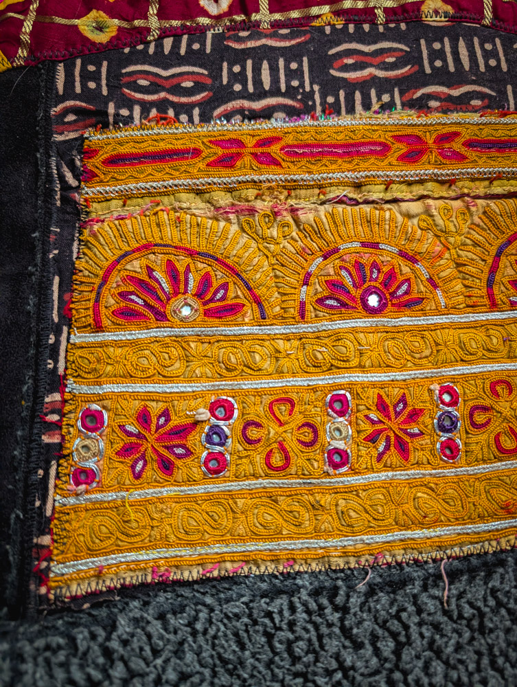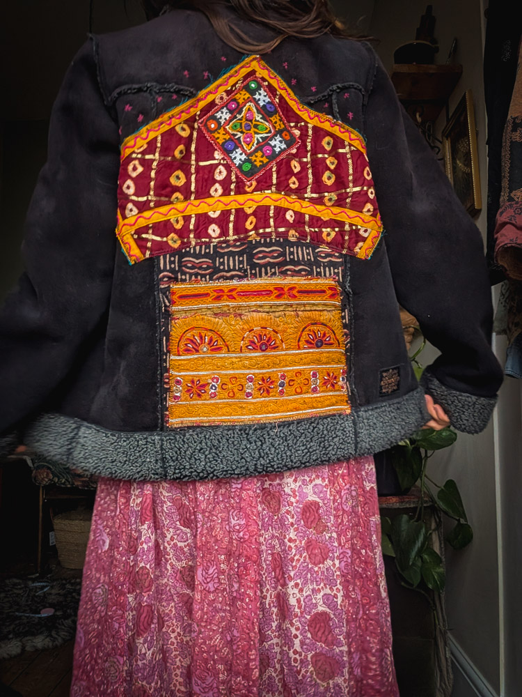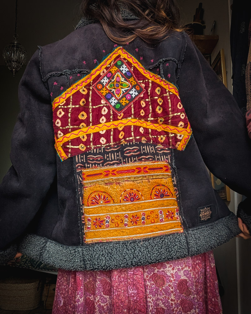 A unique, wonderful faux suede jacket reworked with a patchwork of cheery fabrics. All the fabrics used are sourced second hand to keep this as sustainable as possible including the threads Sarah has stitched the stars on with. Once a simple piece, it is now totally transformed and guaranteed to get compliments.