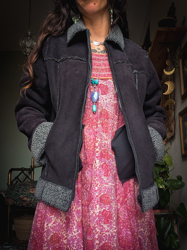 Jacket itself is a retro, zip up faux suede with black faux fur, fully lined with front hidden pockets