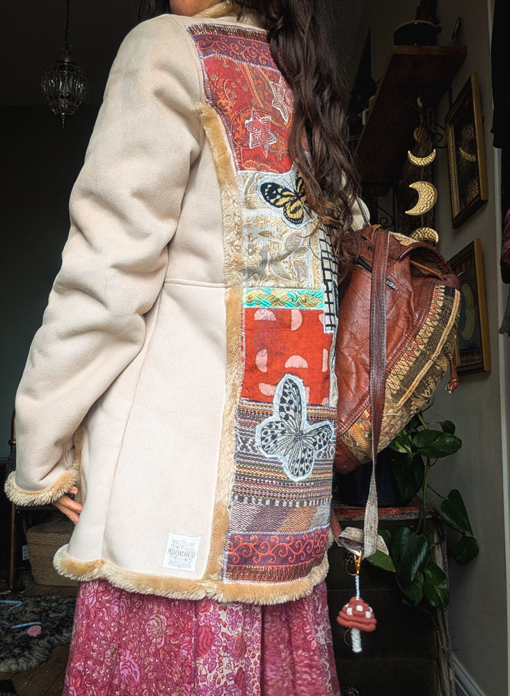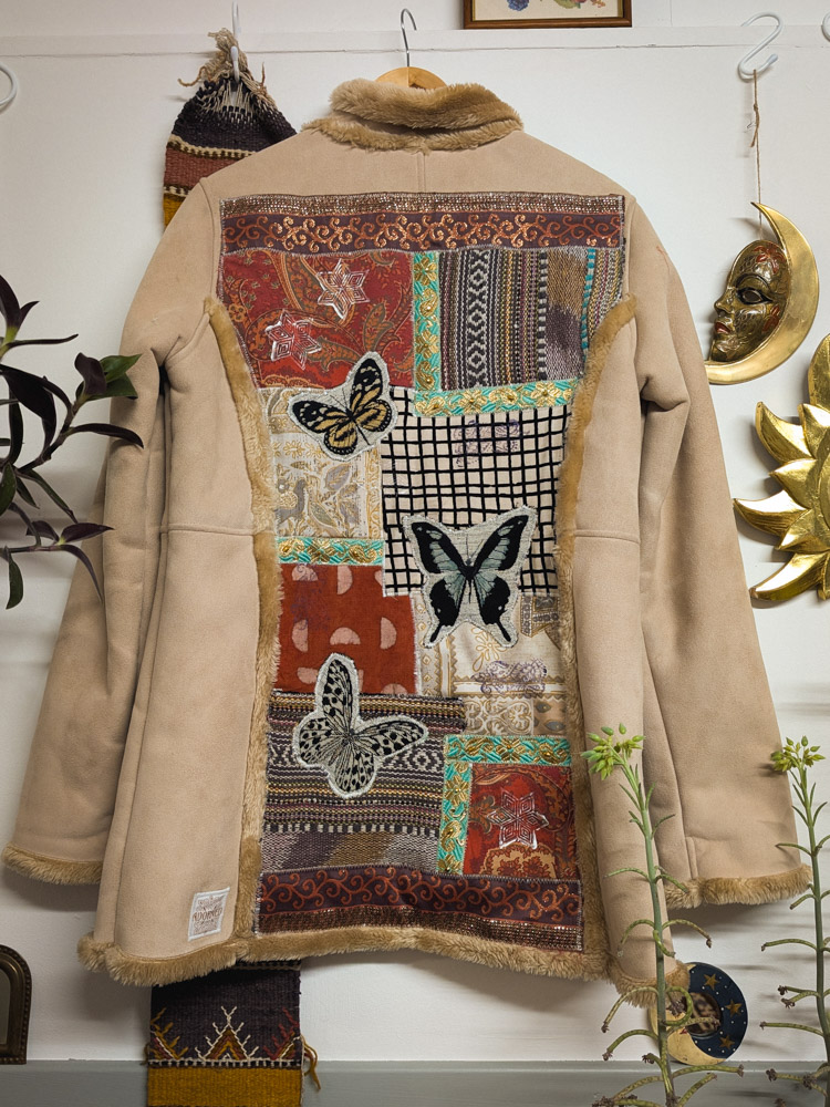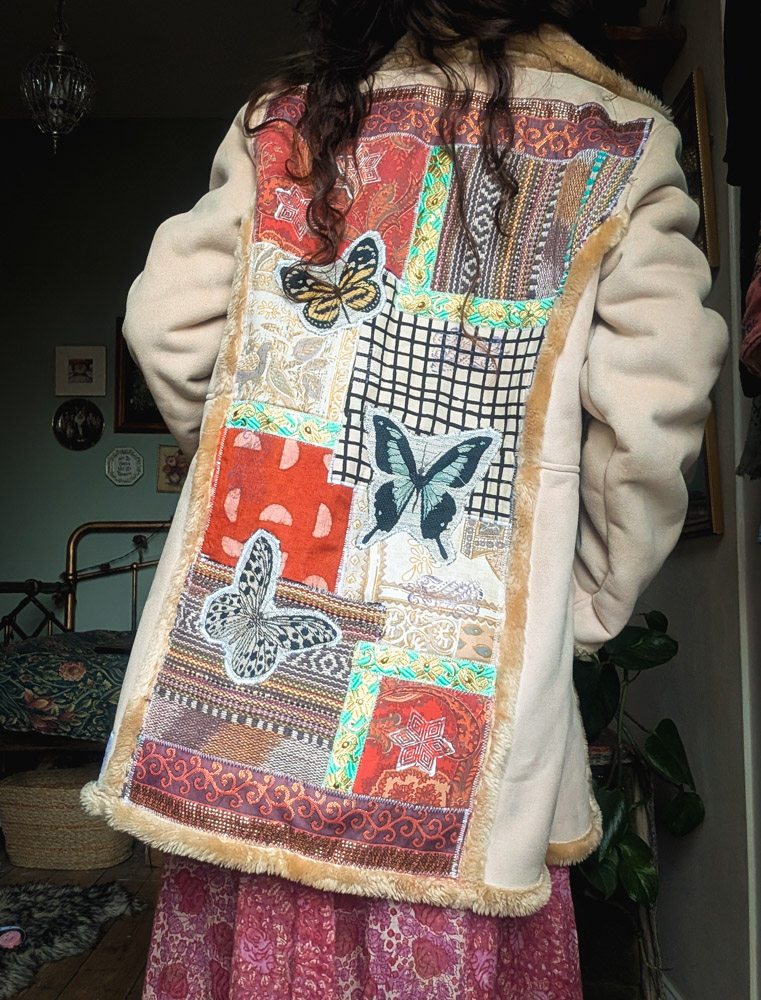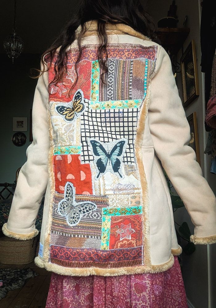 This is one of Sarah’s favourite makes of the year so far. A lot of love went into this and it took over three hours to select the fabrics, arrange them and stitch them on to this faux suede jacket. All the fabrics used are sourced second hand to keep this as sustainable as possible. Once a simple piece, it is now totally transformed and guaranteed to get compliments.