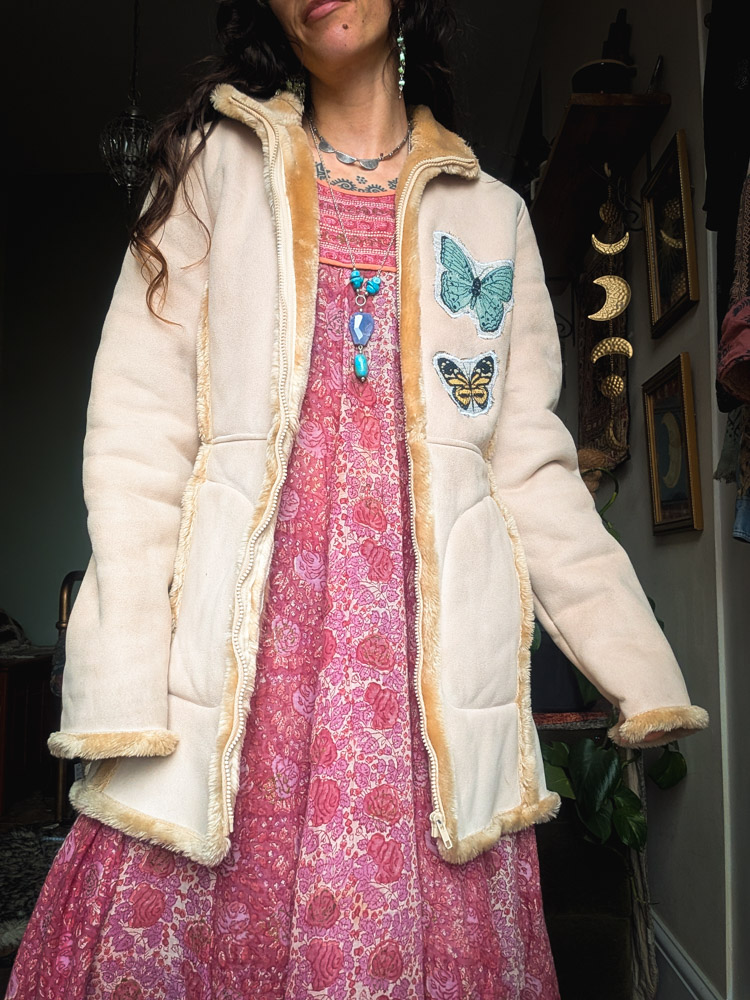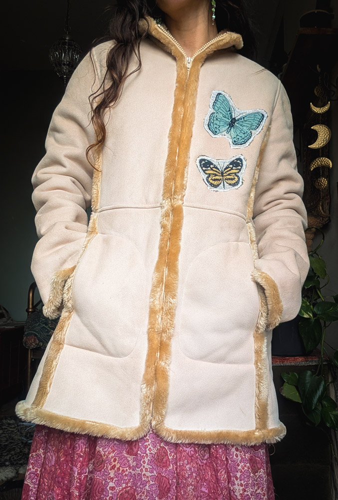Jacket itself is a zip up beige faux suede with a caramel faux fur, fully lined with front pockets.