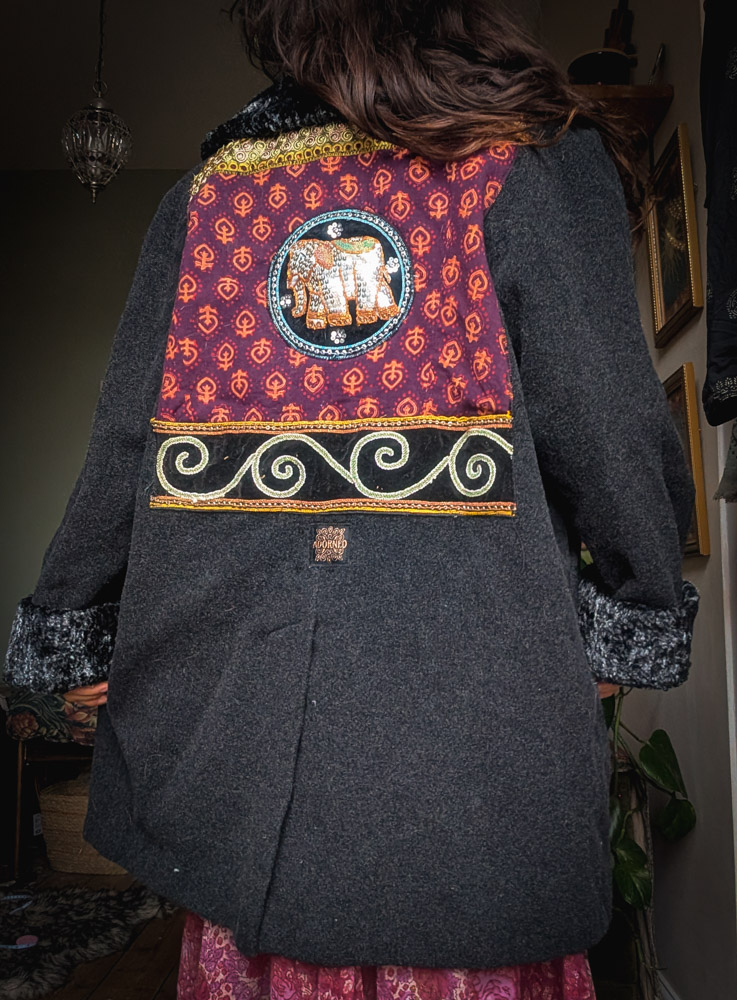 A unique, wonderful winter coat reworked with a patchwork of cheery fabrics. All the fabrics used are sourced second hand to keep this as sustainable as possible and collected over many years. Once a simple piece, it is now totally transformed and guaranteed to get compliments. The rework is ever so slightly off centre for this one, reflected in the price.