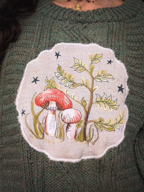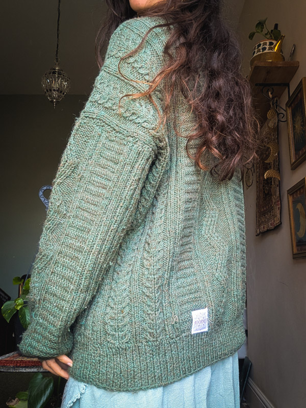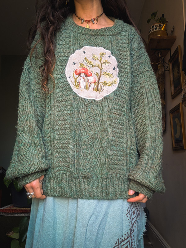 Handknitted vintage cable knit jumper in a gorgeous soft green colour. Classic high neck fit, relaxed body and full length sleeves. Reworked with a mushroom and fern patch which was painted and embroidered on an offcut of vintage Cypriot lace (the other part went to fix Sarah’s jeans!) A one-of-a-kind, sustainably made piece. This can be machine washed at 30C or less following simple care instructions!
