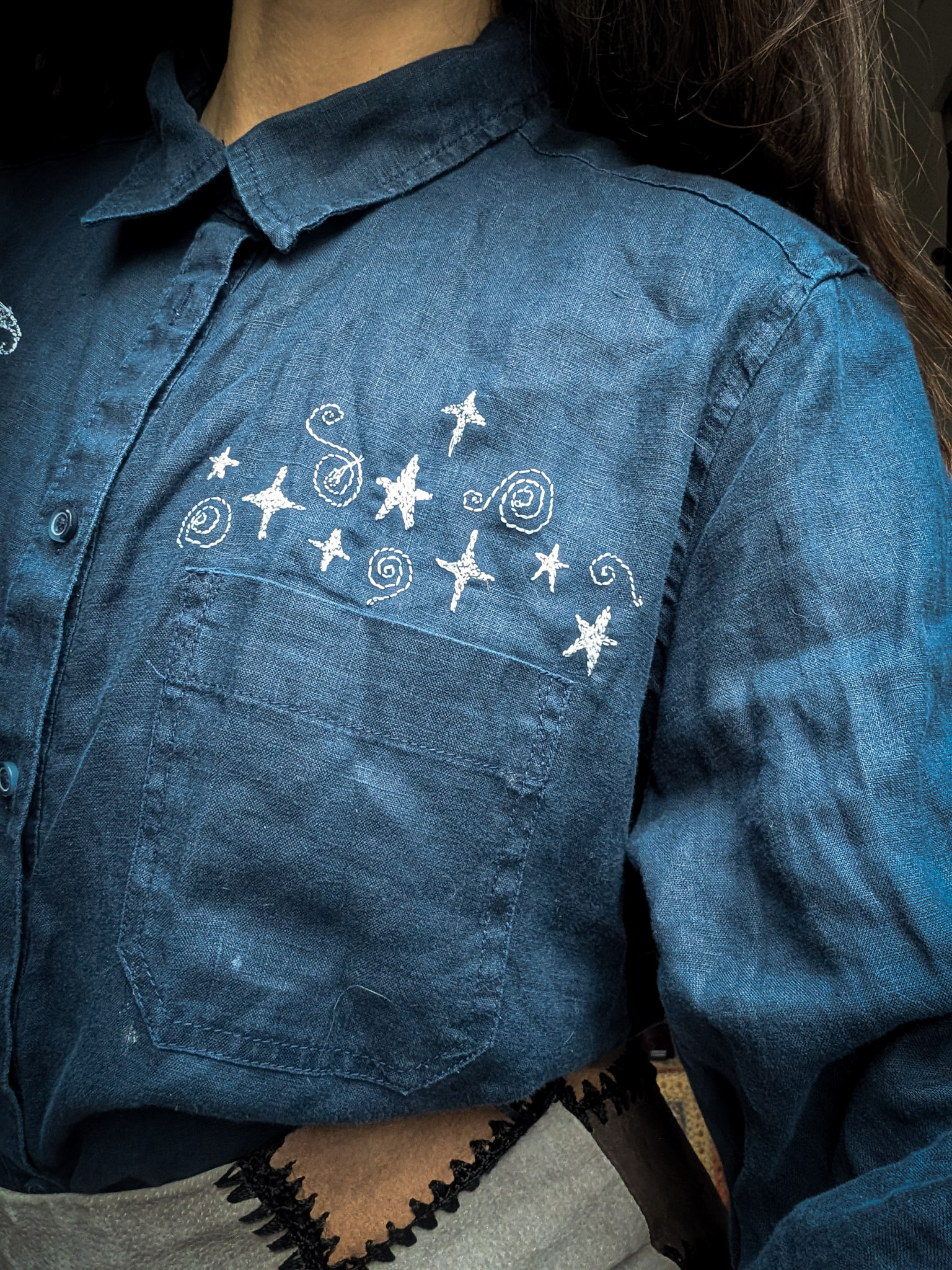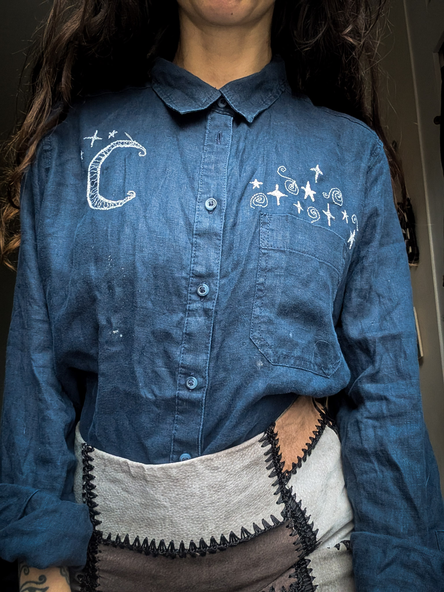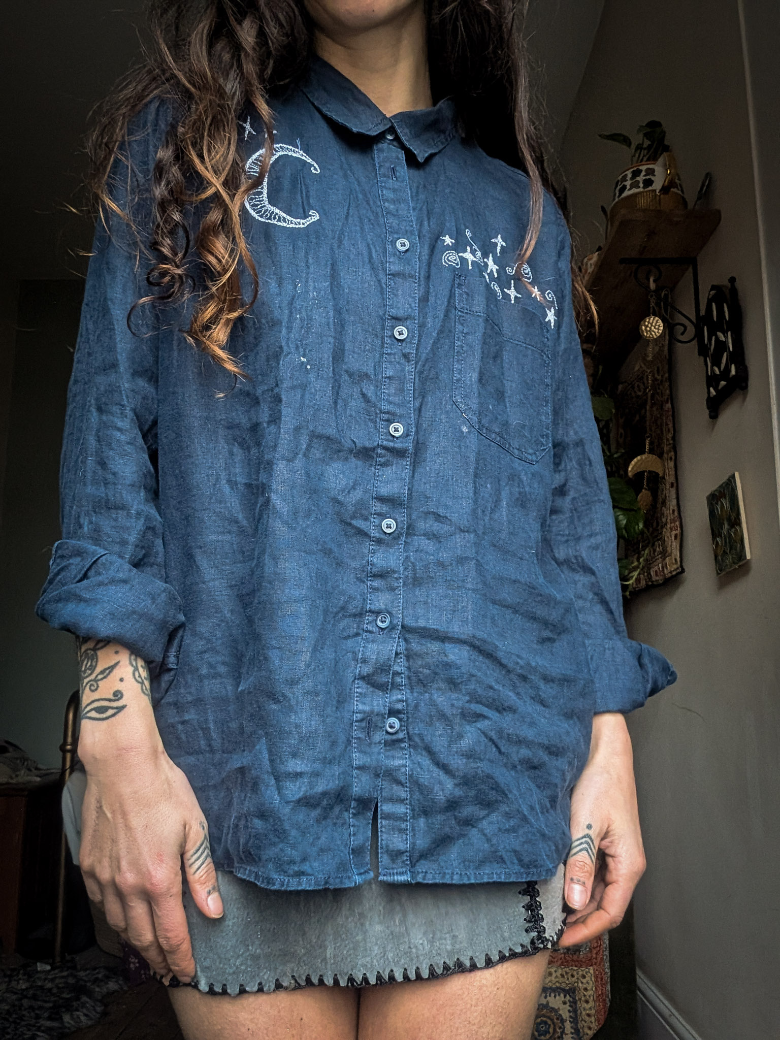 Deep blue linen shirt with a lovely relaxed fit. Classic button-up style with little front pockets. Reworked by Sarah who’s drawn celestial doodles over the front in embroidery.