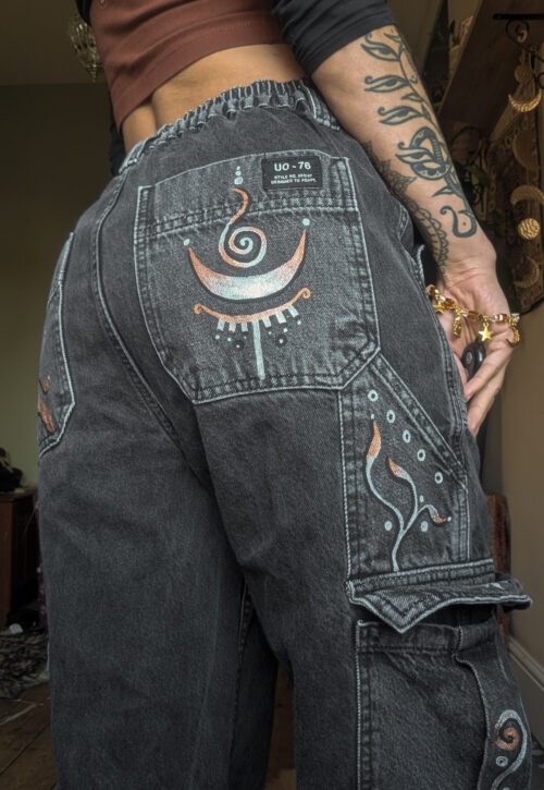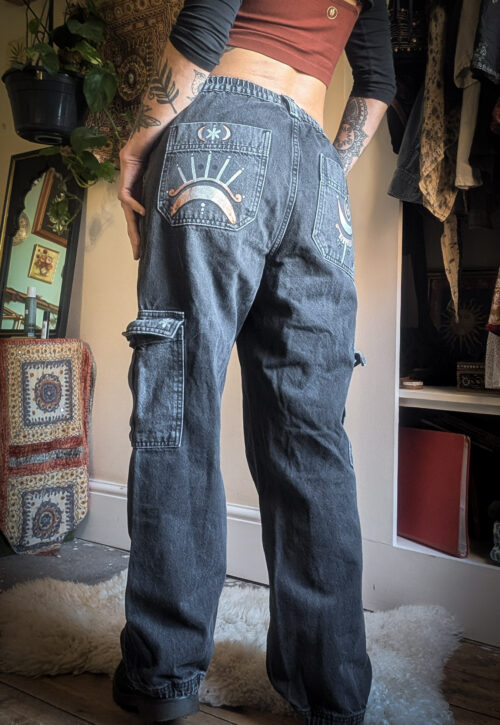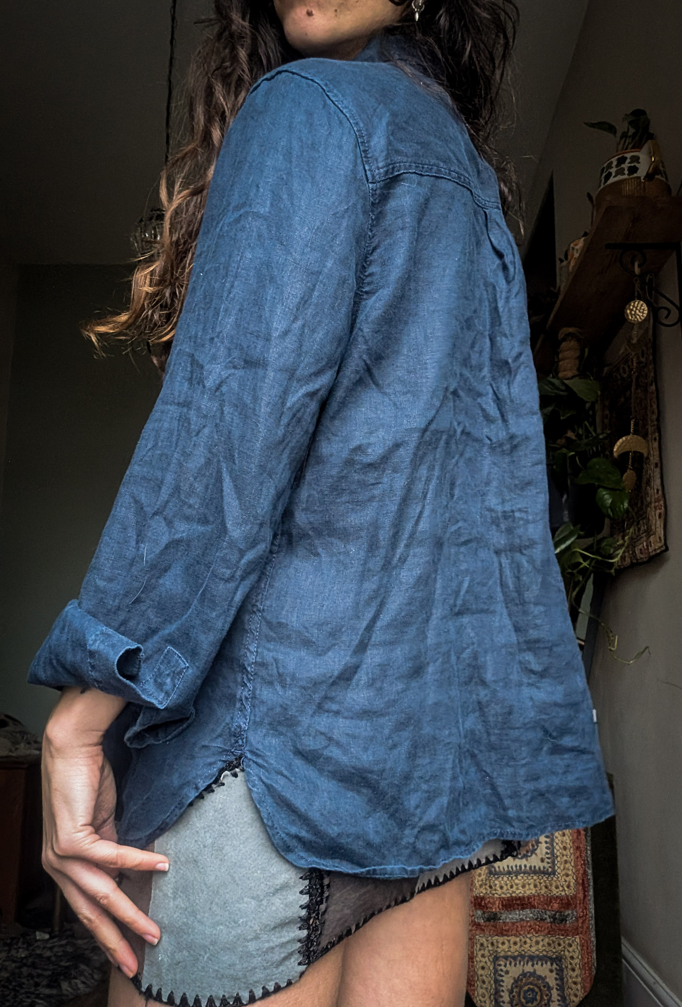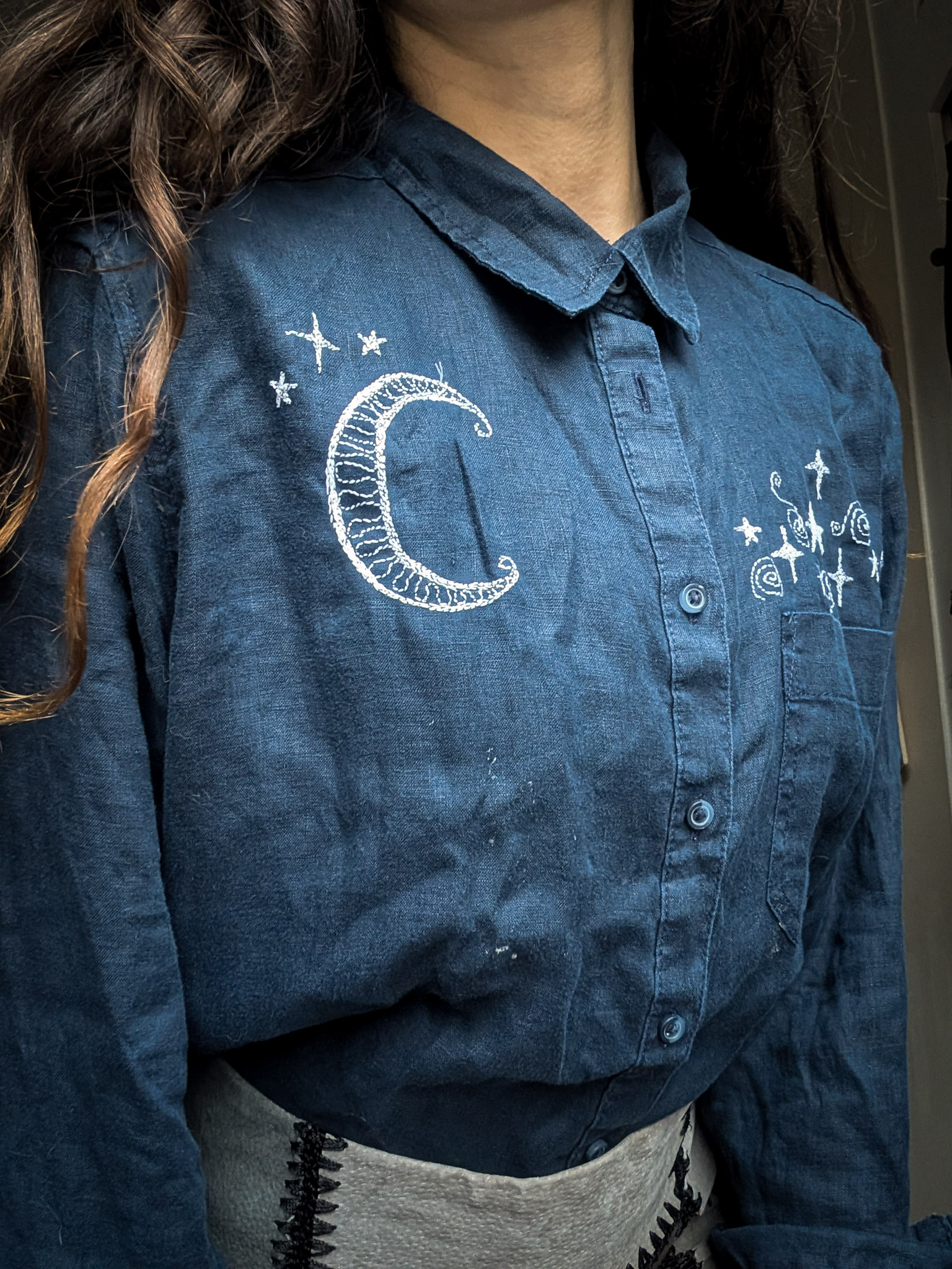 Deep blue linen shirt with a lovely relaxed fit. Classic button-up style with little front pockets. Reworked by Sarah who’s drawn celestial doodles over the front in embroidery.