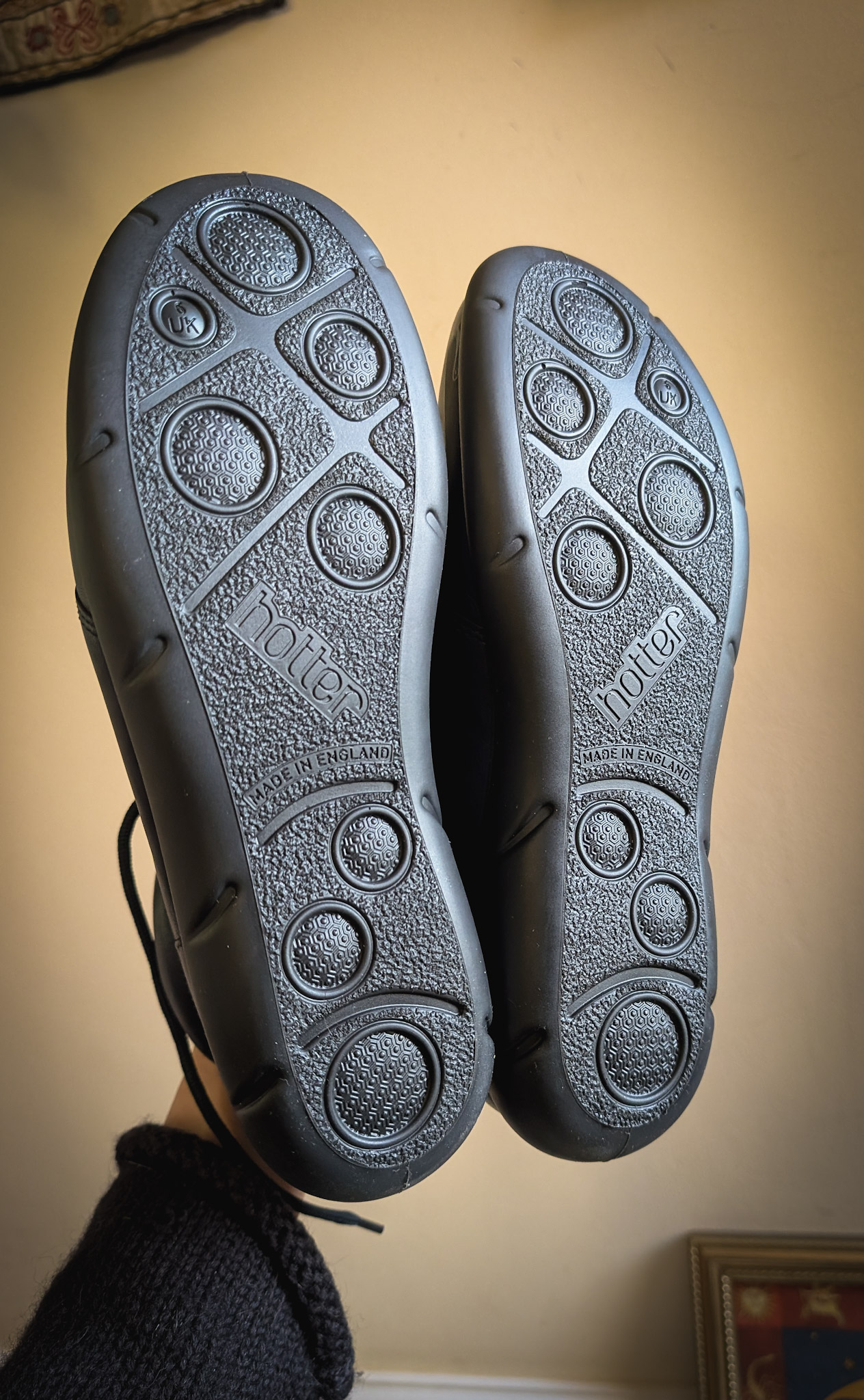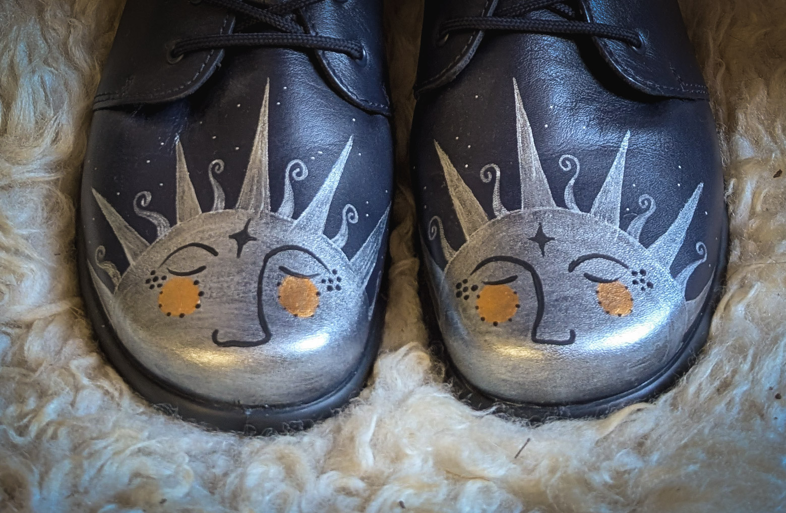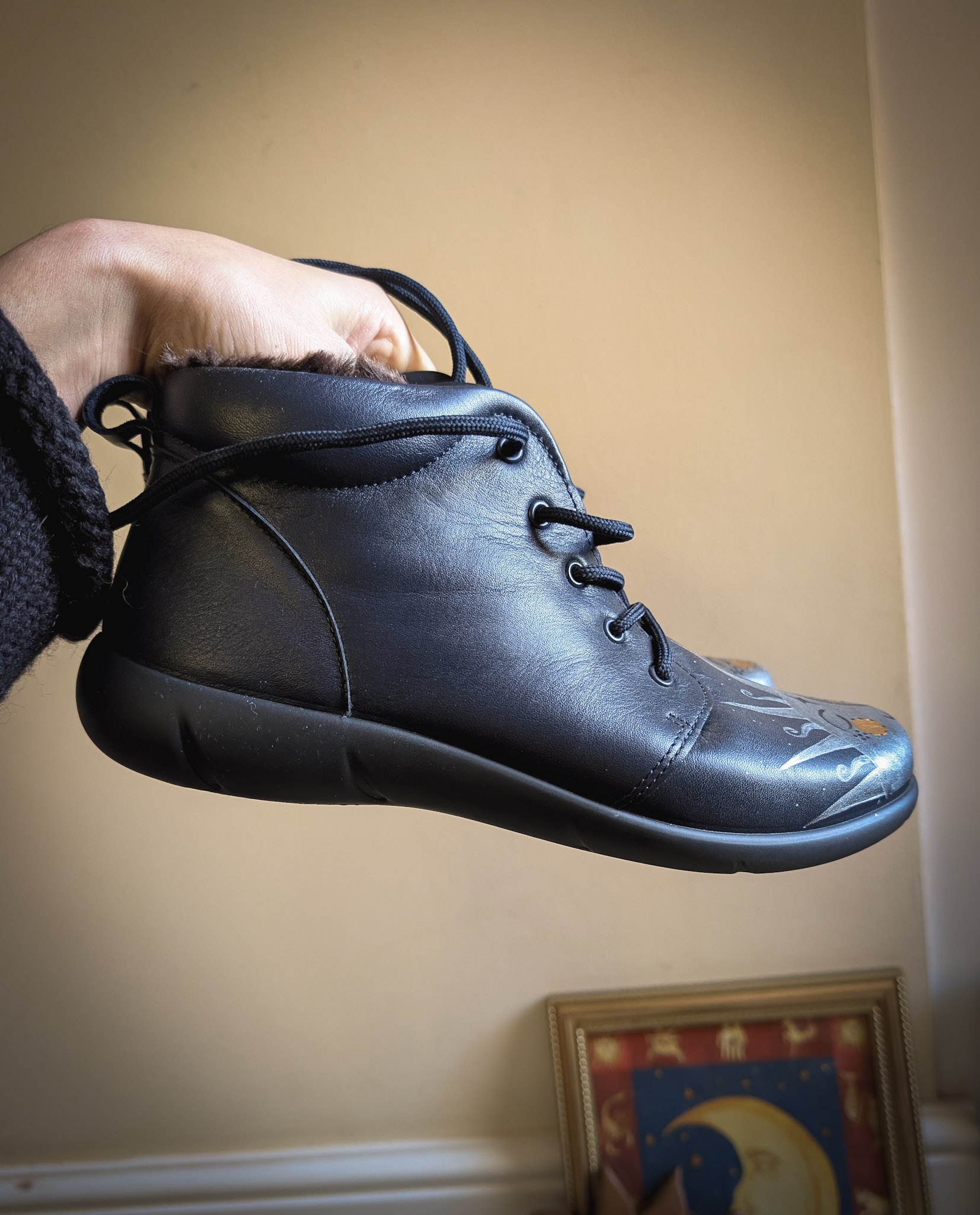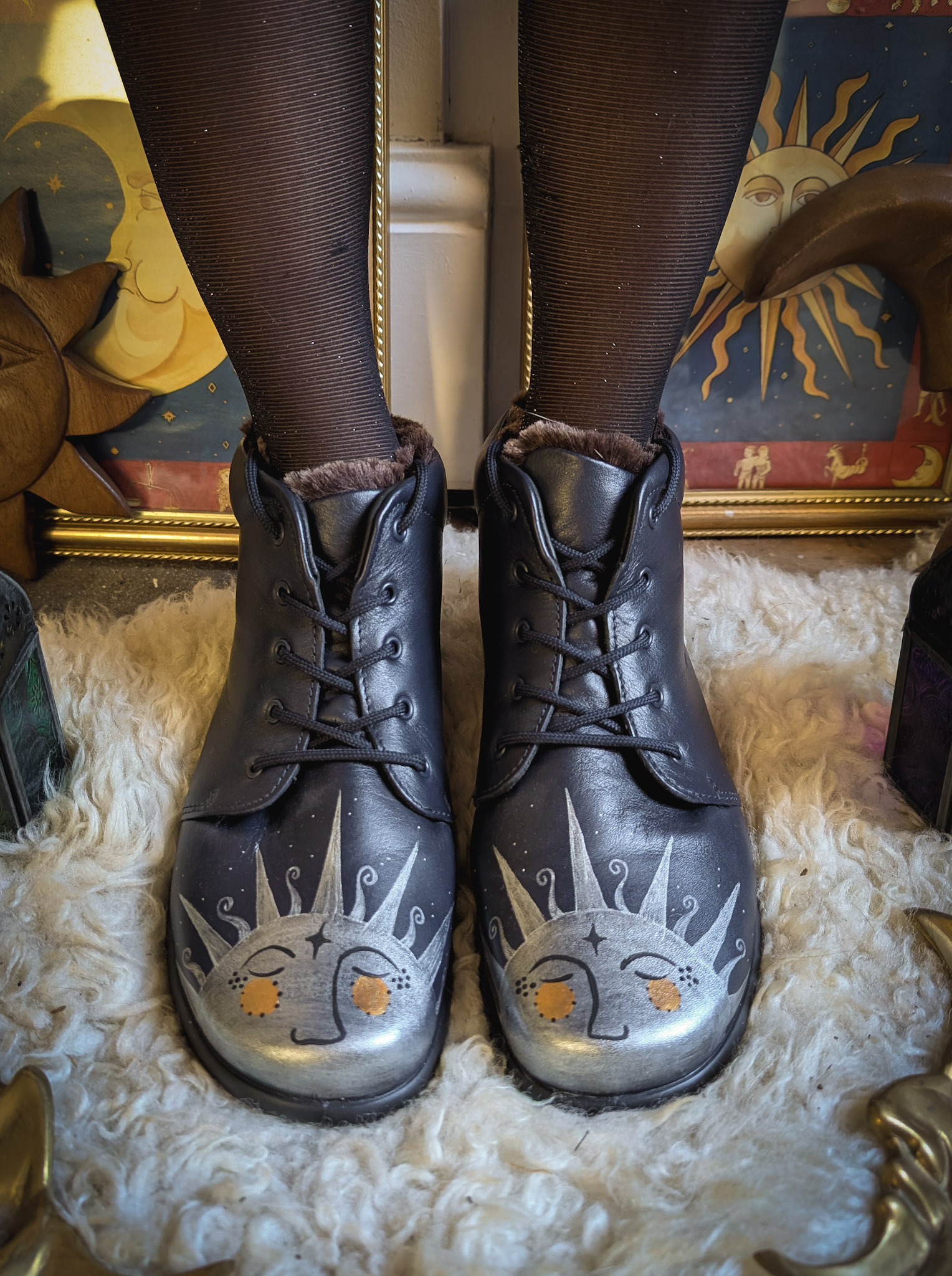 Thrifted (but apparently unworn) booties from Hotter. RRP £65. Soft navy leather with a faux-fur lining and tie-up front. Painted with cheery suns on the front, a signature upcycle of ours for many years.