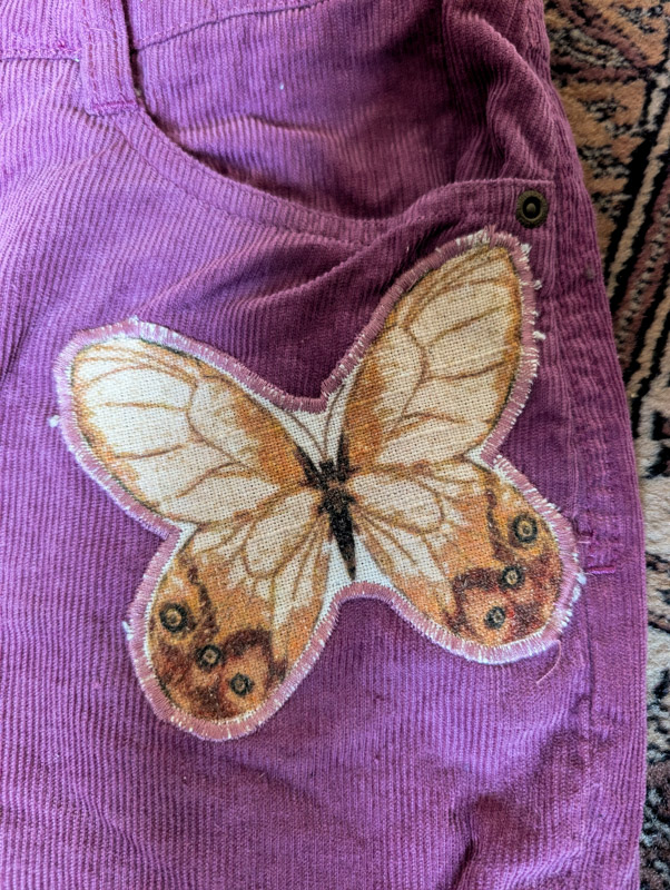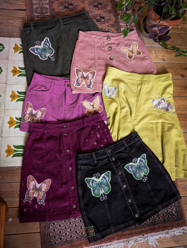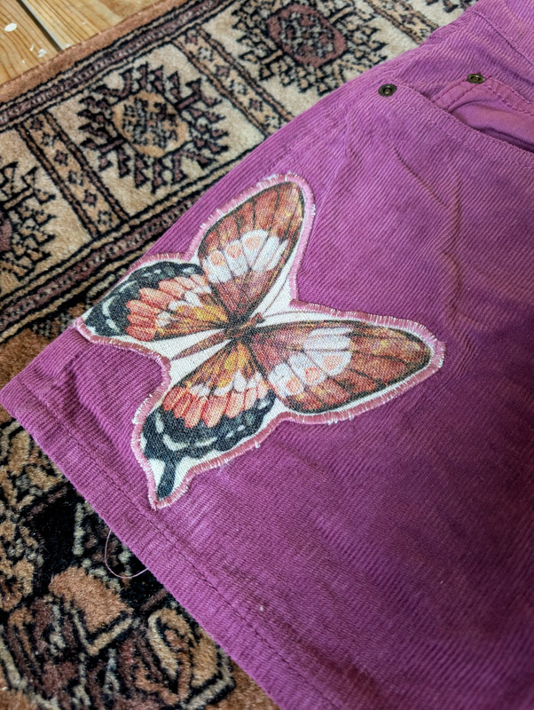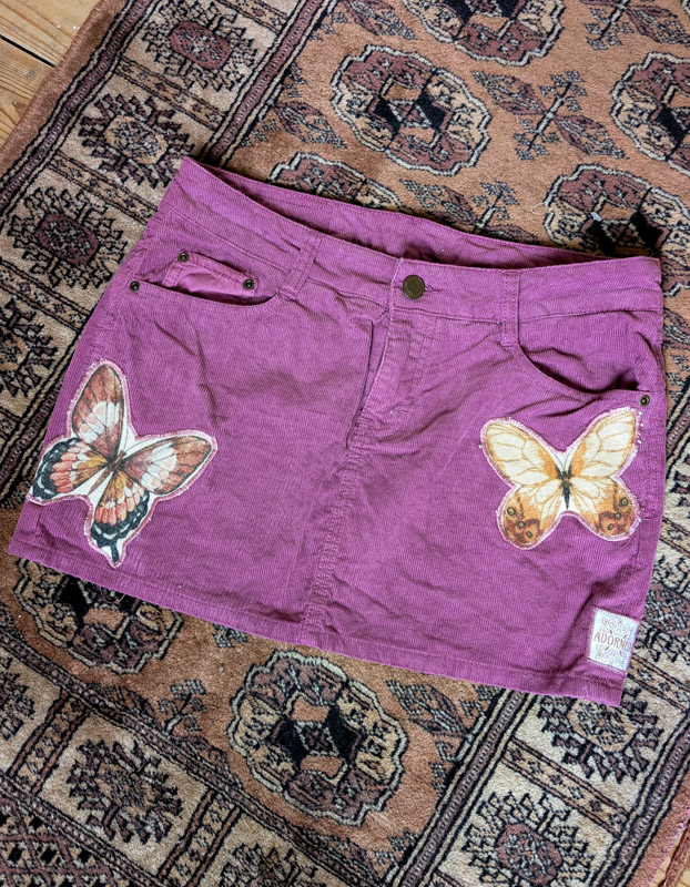 Preloved rich purple corduroy mini skirt. Mid-low waisted with button + zip fly, belt loops and A-line fit. Reworked on the front with tapestry woven butterflies taken from an old cushion cover.