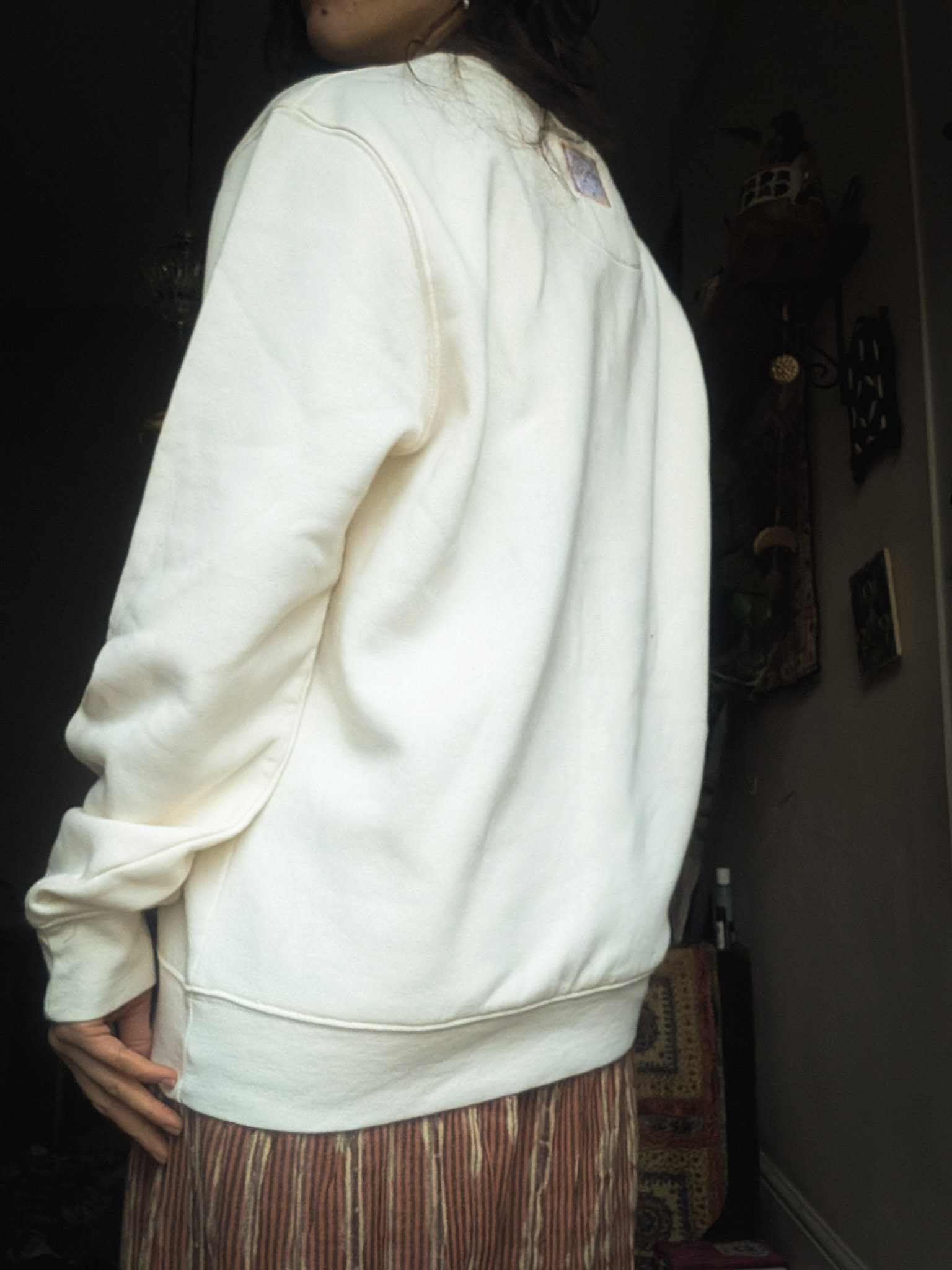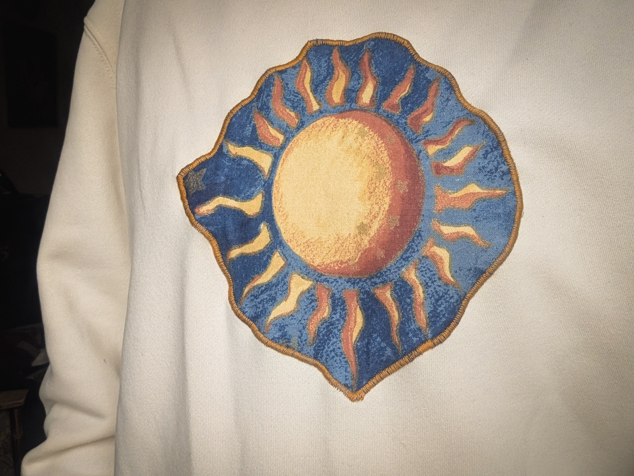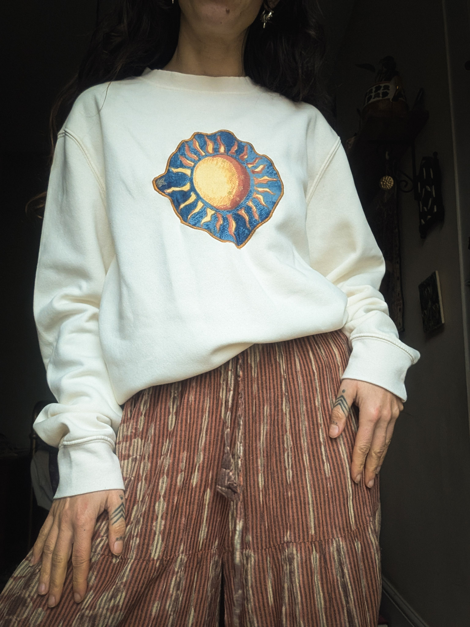 Thrifted cosy sweatshirt with a relaxed fit. Reworked with a vintage sun motif reclaimed from a piece of 90s fabric sourced from France.