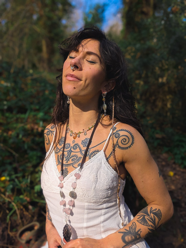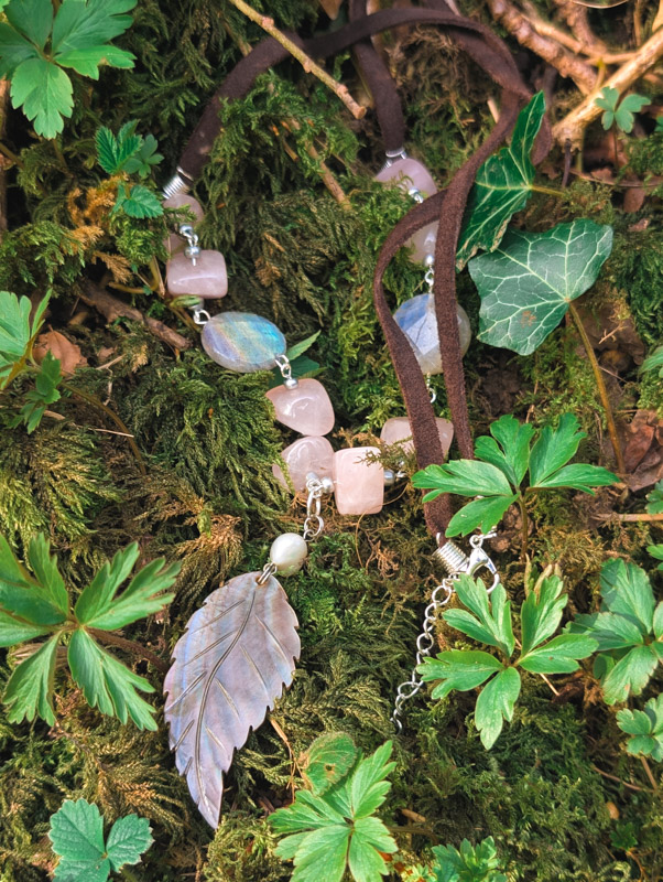 Statement bohemian necklace with a wonderful feminine energy. All the gemstones, leaf and suede are recycled, making this a one-of-a-kind sustainable piece. With silver plated findings and an extender. Approx 75% recycled.