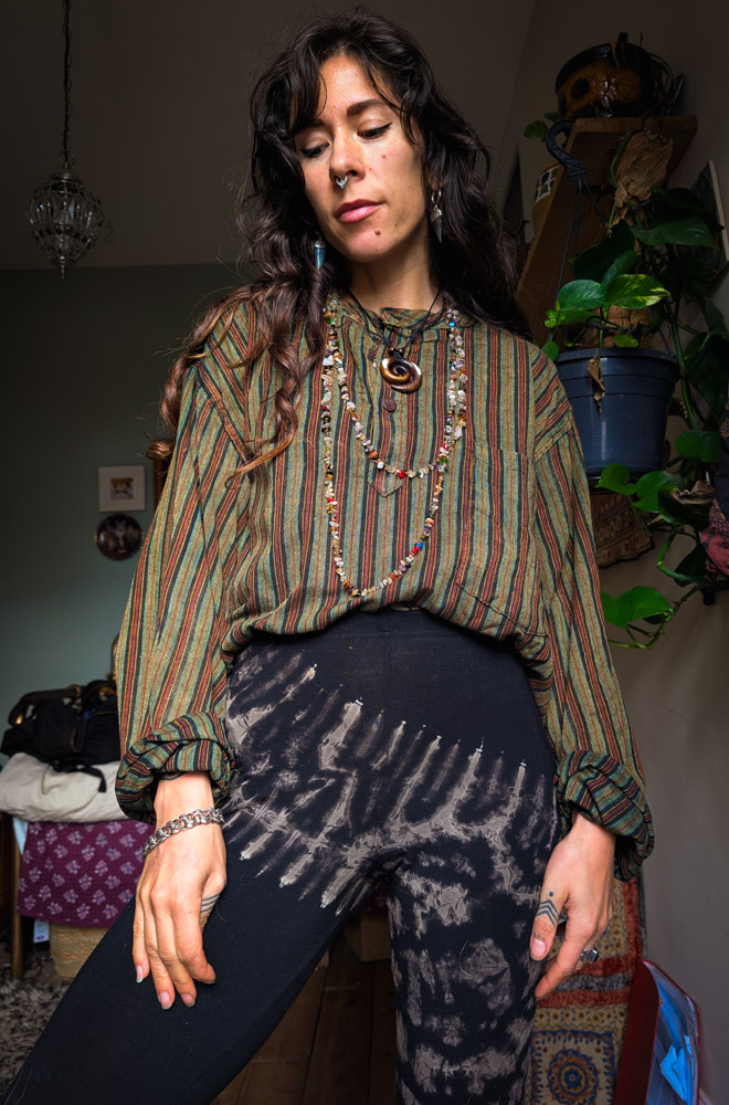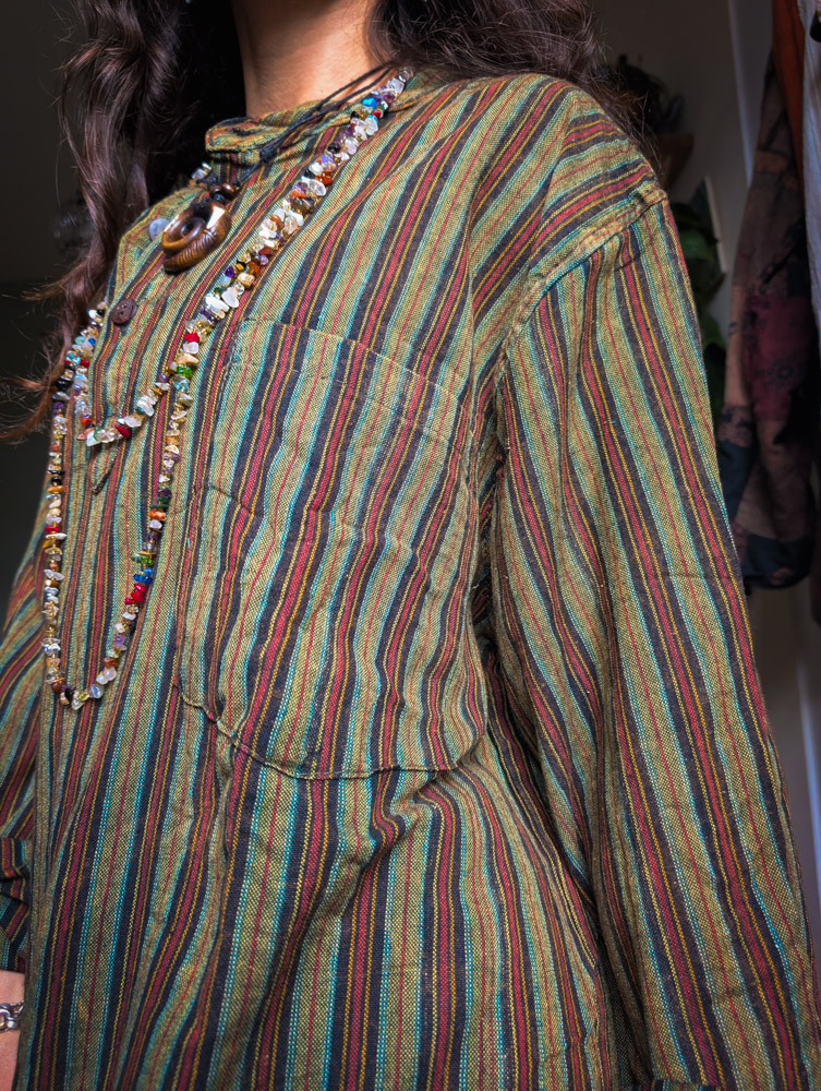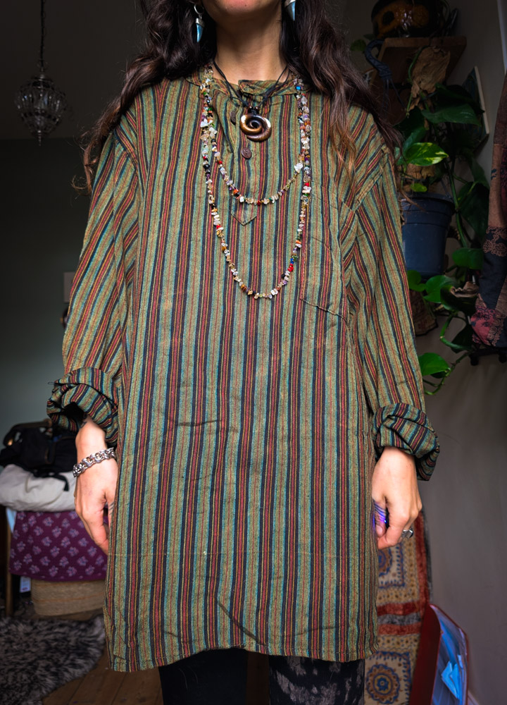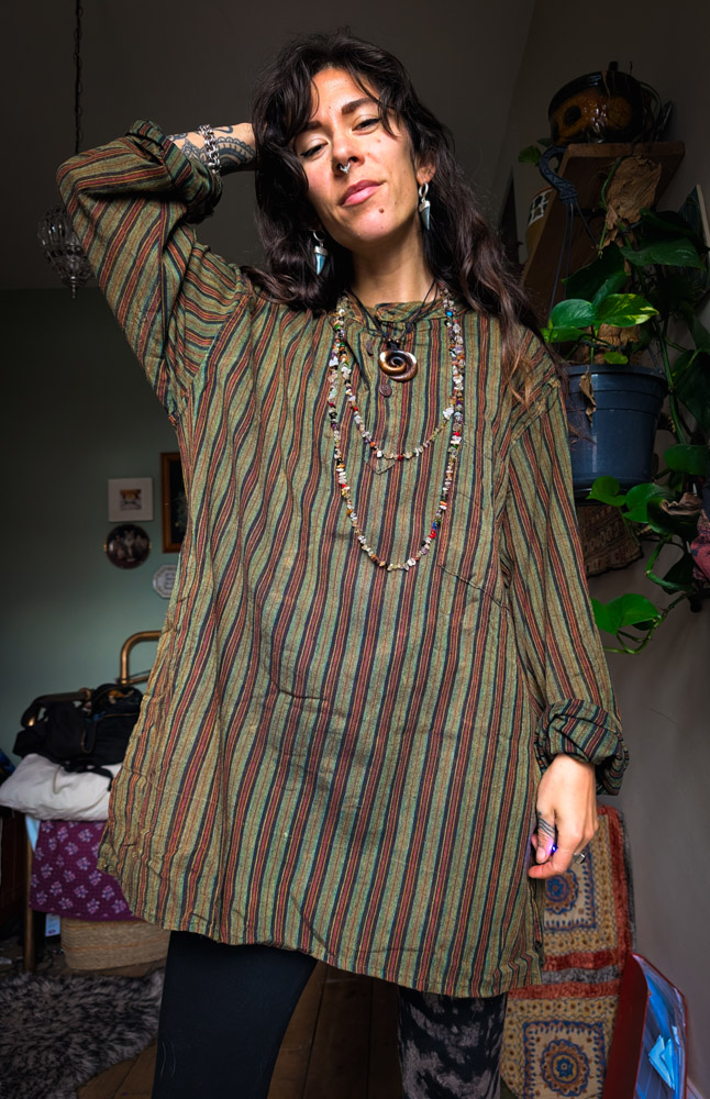 A simple, easy to wear and unisex hippie shirt. We love the earthy, stonewashed effect of this. Three buttons, collar and front pocket, so easy to wear! Size up and wear with tights and docs for ladies or keep it cute under dungarees. As these are not mass-produced there can be slight variations in the colour.