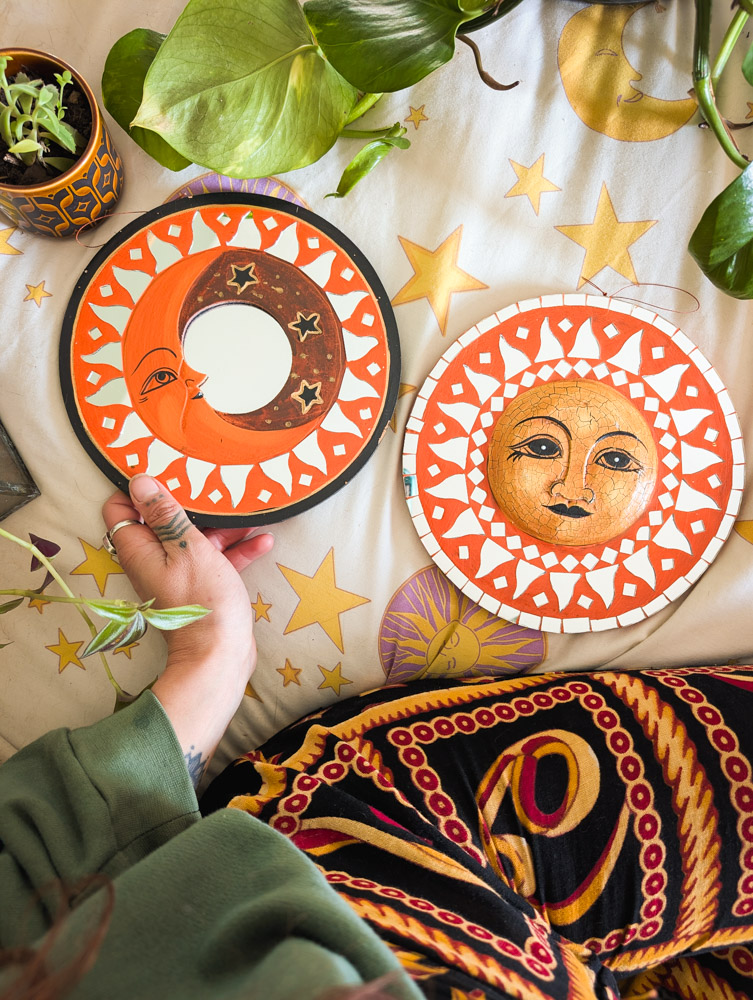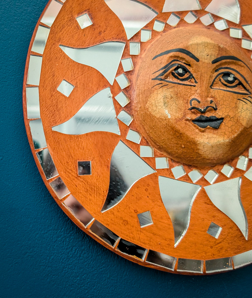 A gorgeous decorative mirror with the ever-popular moon design. Painted in rich earthy tones, this piece of wall art features a rustic, distressed style with delicately cut mirrored pieces.