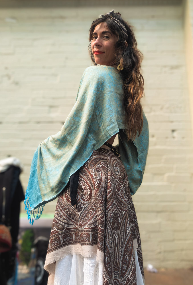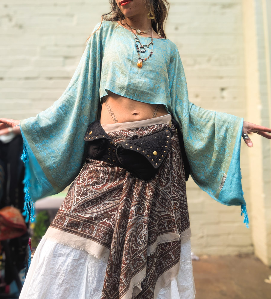 We love scarves, but often find we have too many. So what do you do? You turn them into a long sleeved crop top. This has a very cropped middle, super long arms and relaxed fit. These are best for short torsos / petite frames or layer with a vest underneath. Just one bit of the neckline that frayed so has been zigzag stitched.
