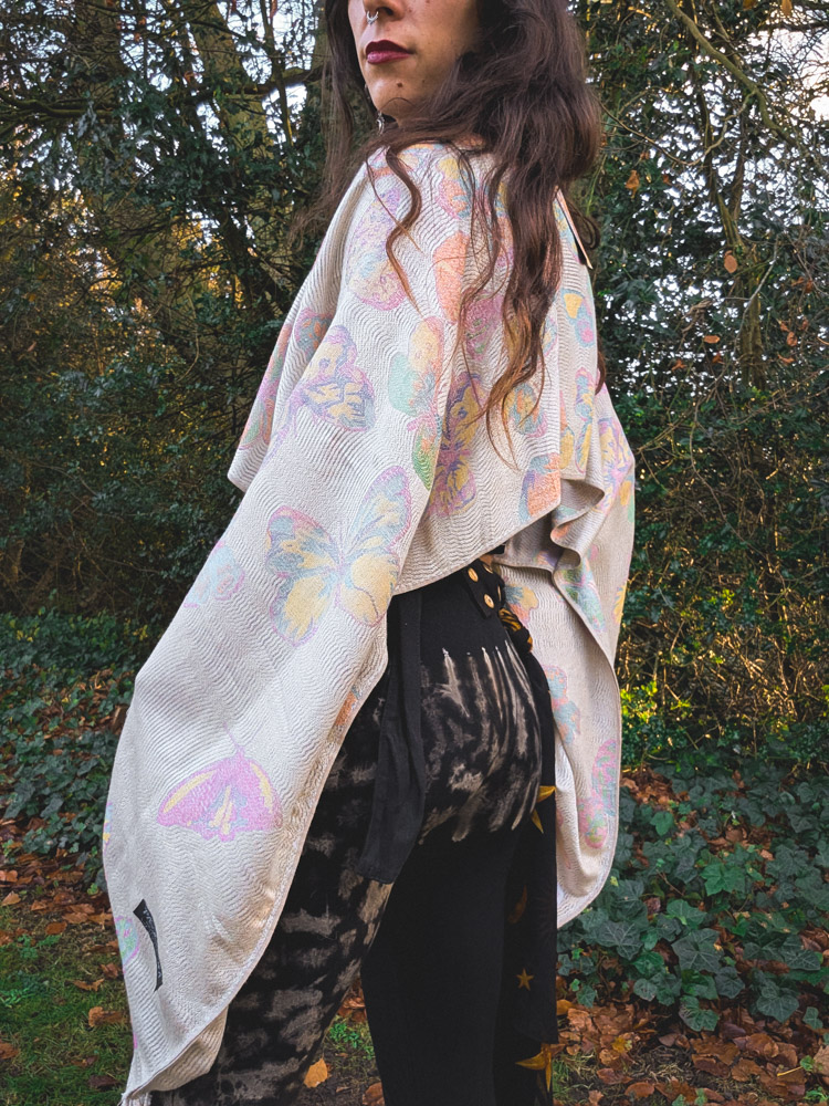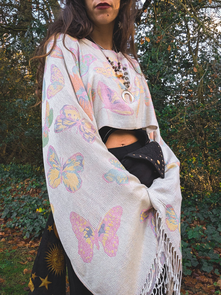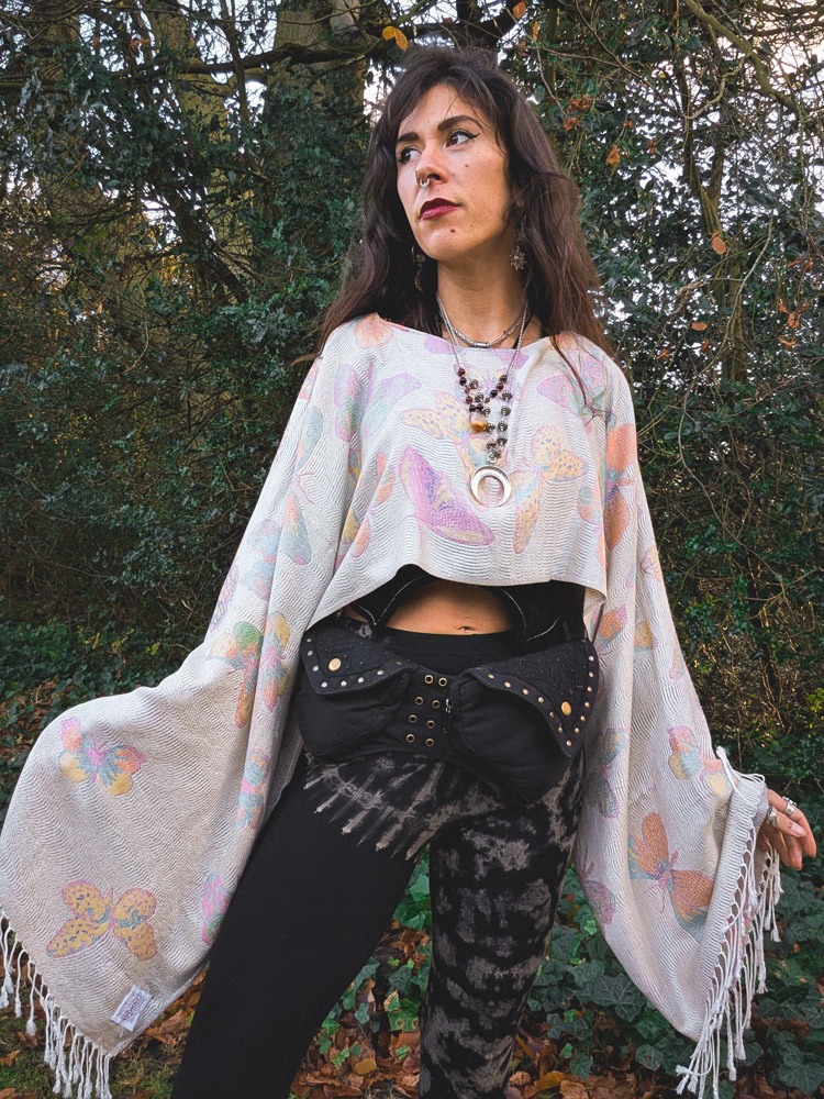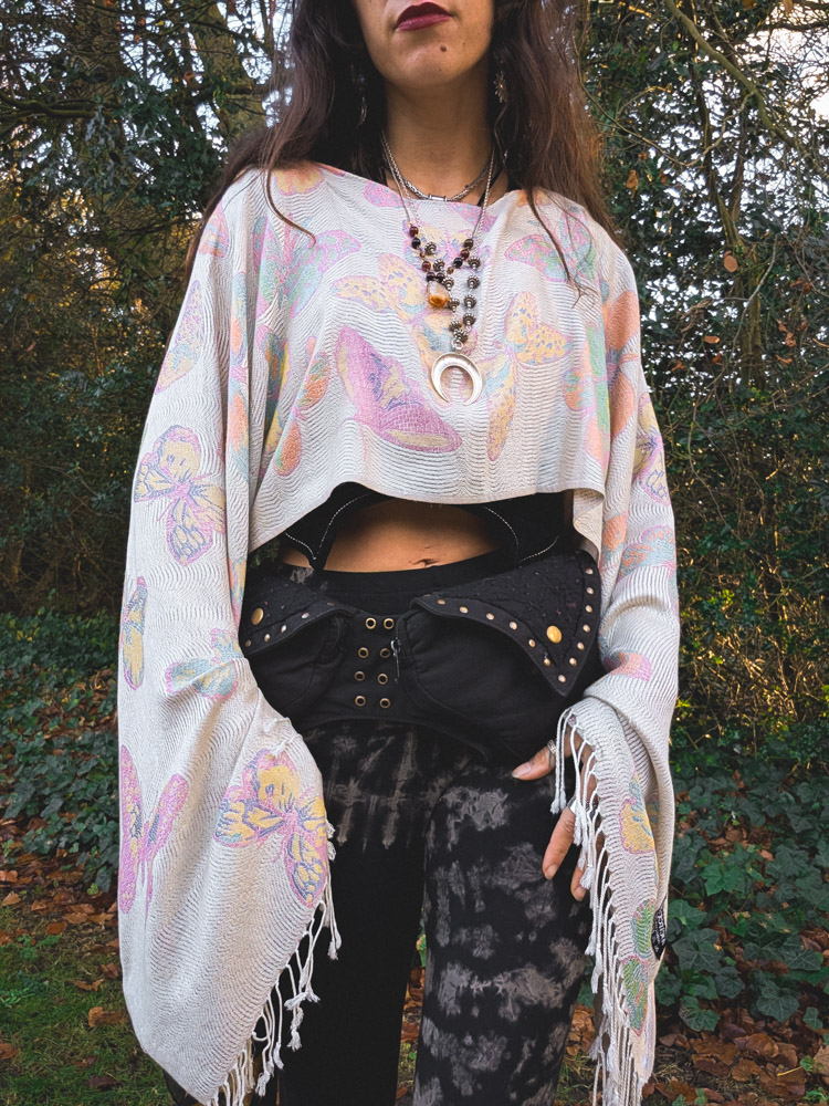 We love scarves, but often find we have too many. So what do you do? You turn them into a long sleeved crop top. This has a very cropped middle, super long arms and relaxed fit. These are best for short torsos / petite frames or layer with a vest underneath.
