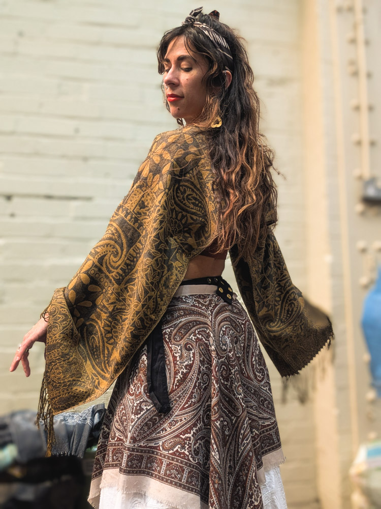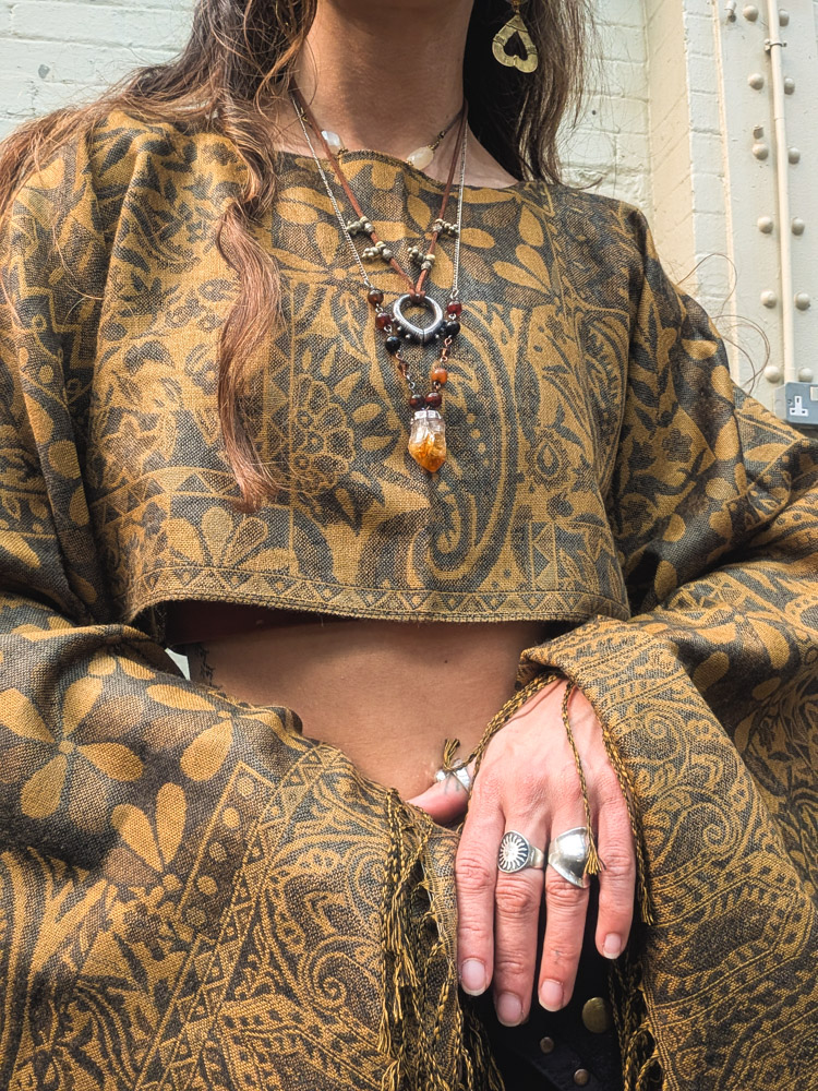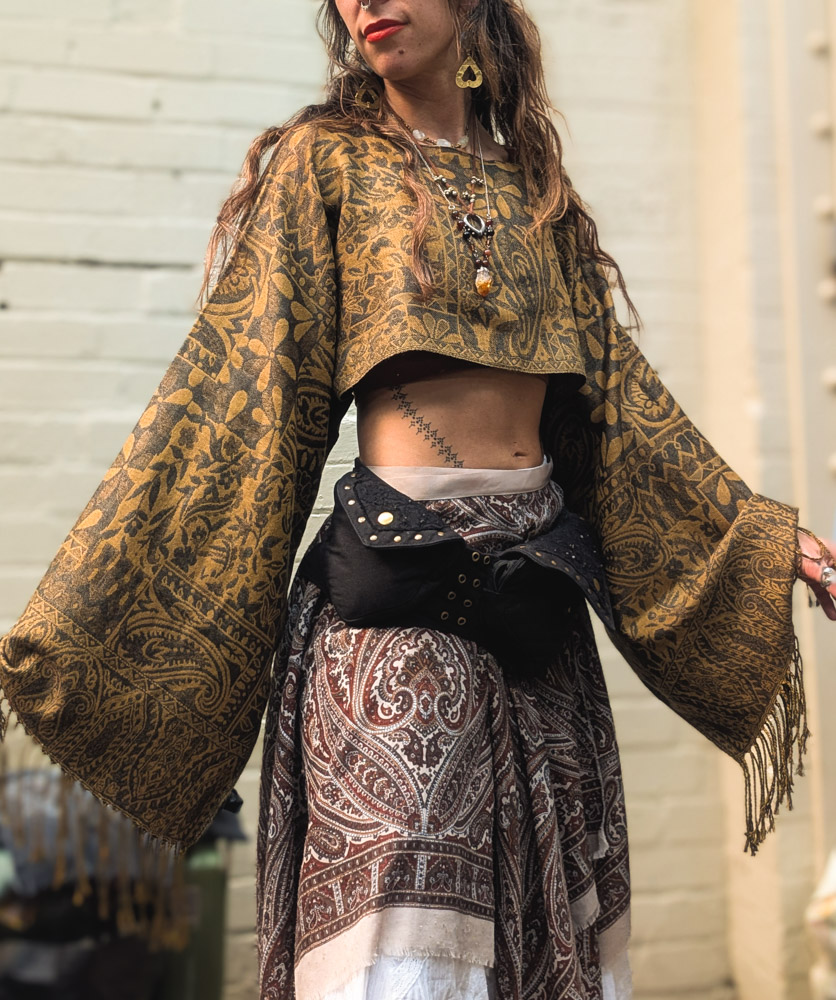 We love scarves, but often find we have too many. So what do you do? You turn them into a long sleeved crop top. This has a very cropped middle, super long arms and relaxed fit. These are best for short torsos / petite frames or layer with a vest underneath. Just one bit of the neckline that frayed so has been zigzag stitched.