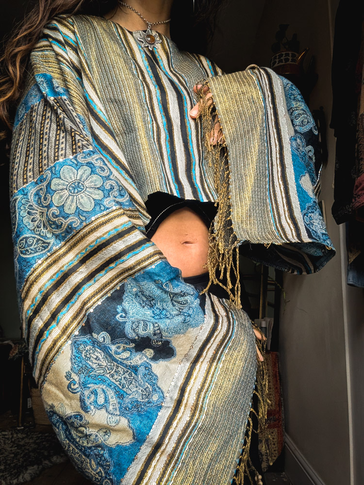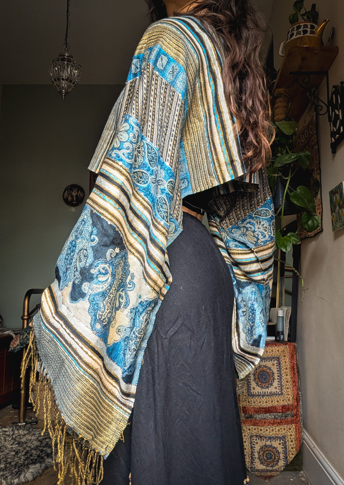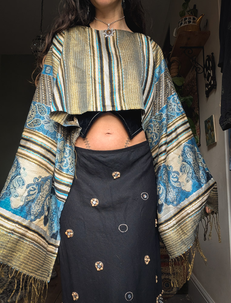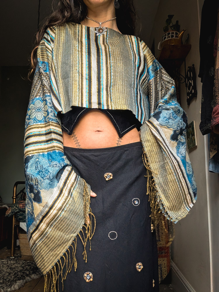 We love scarves, but often find we have too many. So what do you do? You turn them into a long sleeved crop top. This has a very cropped middle, super long arms and relaxed fit. These are best for short torsos / petite frames or layer with a vest underneath. Just one bit of the neckline that frayed so has been zigzag stitched.