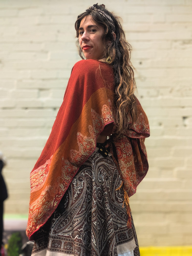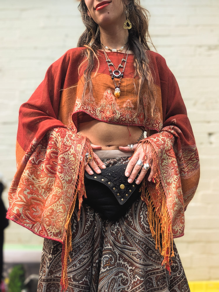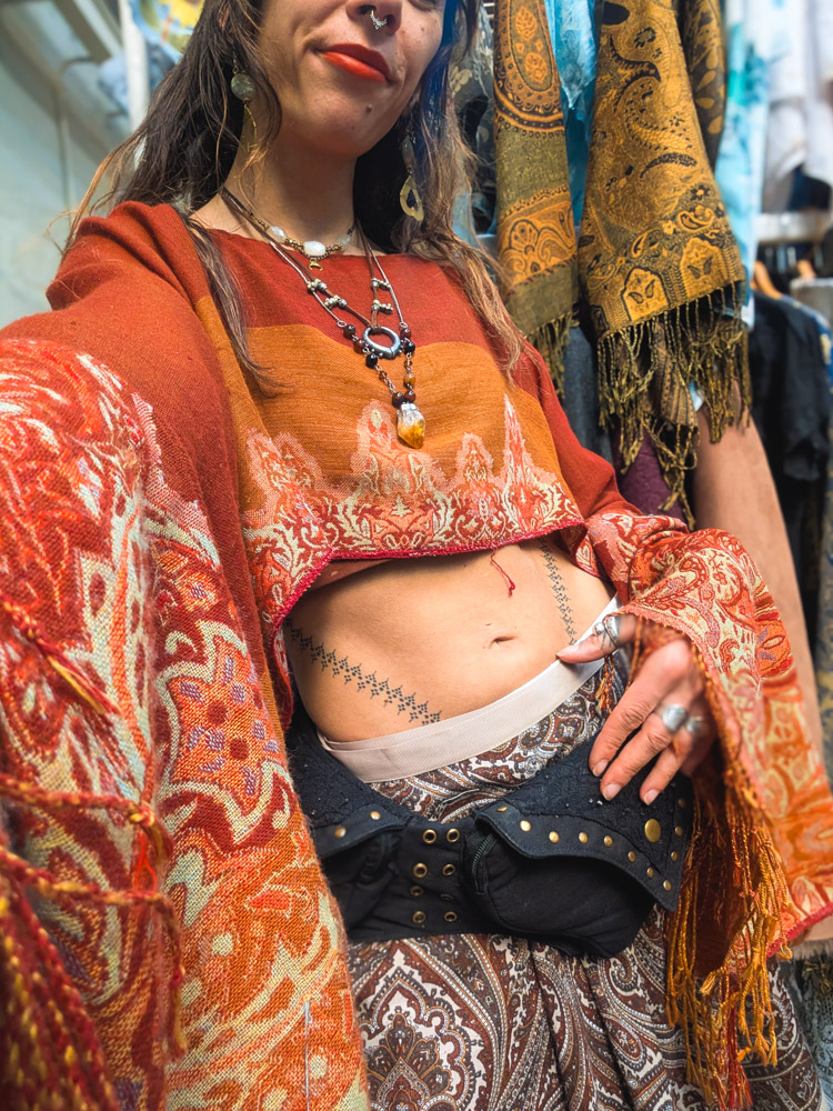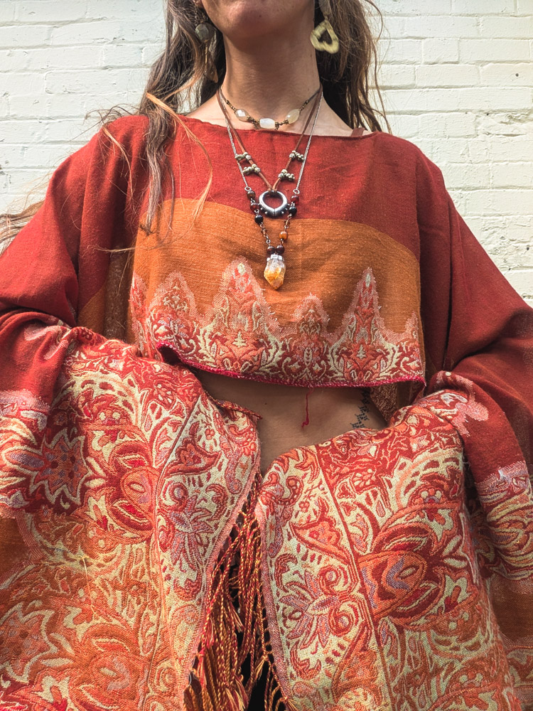 We love scarves, but often find we have too many. So what do you do? You turn them into a long sleeved crop top. This has a very cropped middle, super long arms and relaxed fit. These are best for short torsos / petite frames or layer with a vest underneath. Just one bit of the neckline that frayed so has been zigzag stitched.