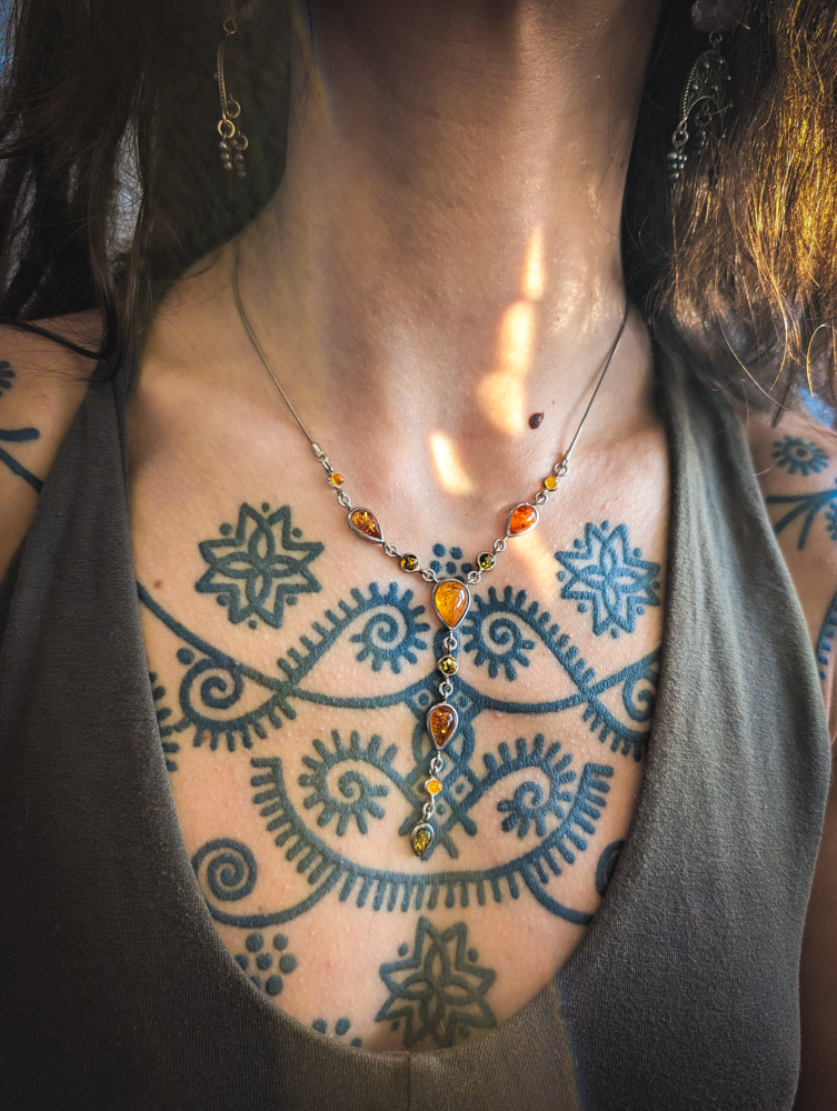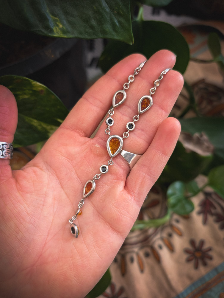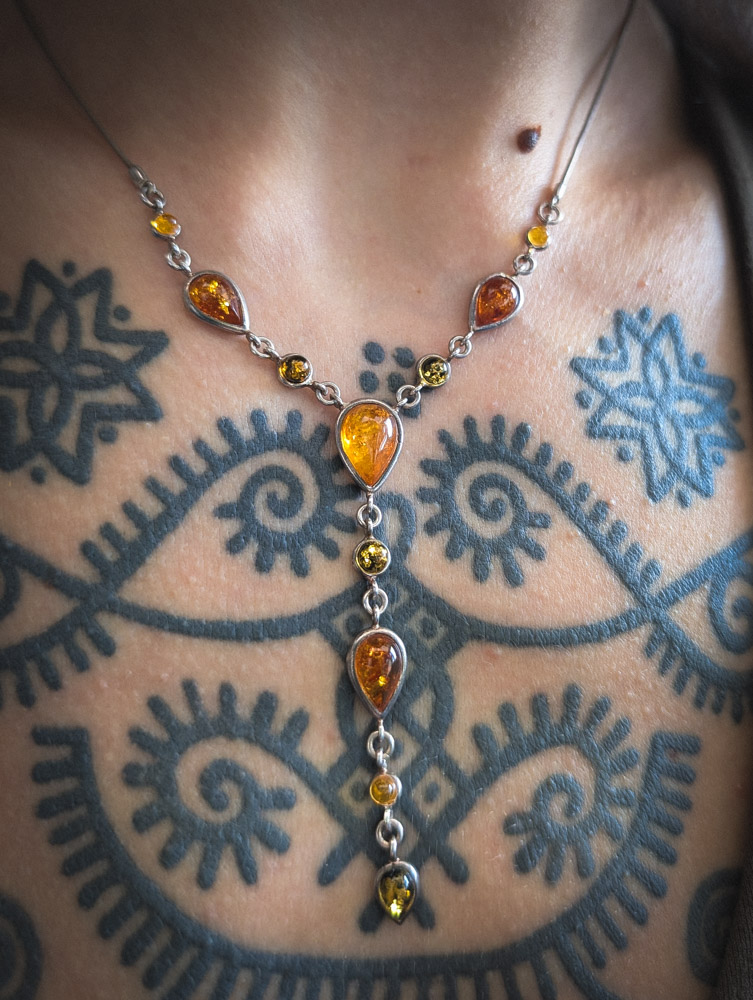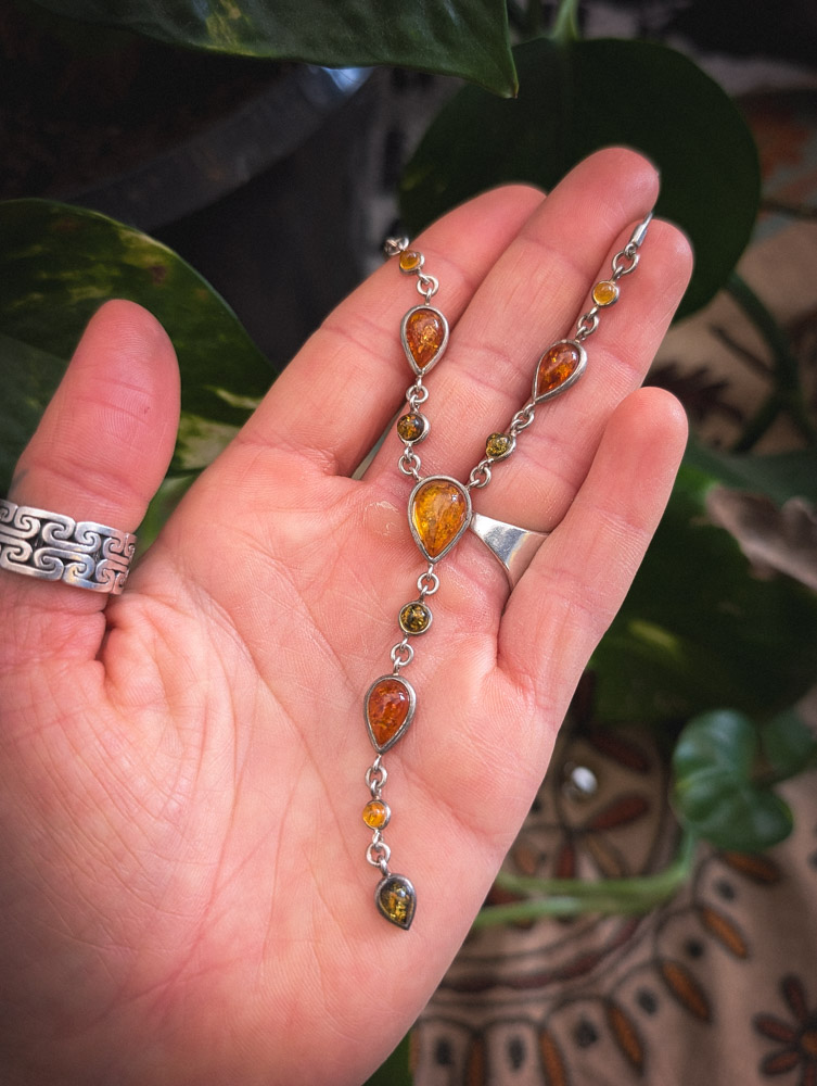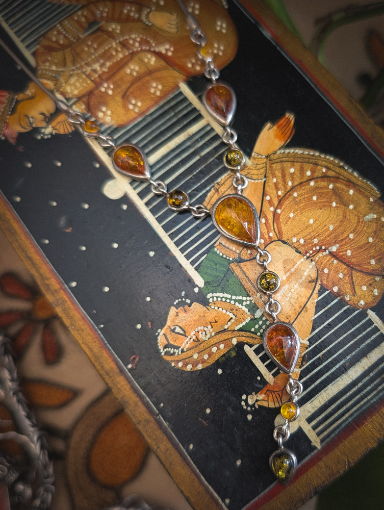 Beautiful bohemian necklace made up of various shades of earthy amber gemstone. Set in silver with a snake chain and clasp.