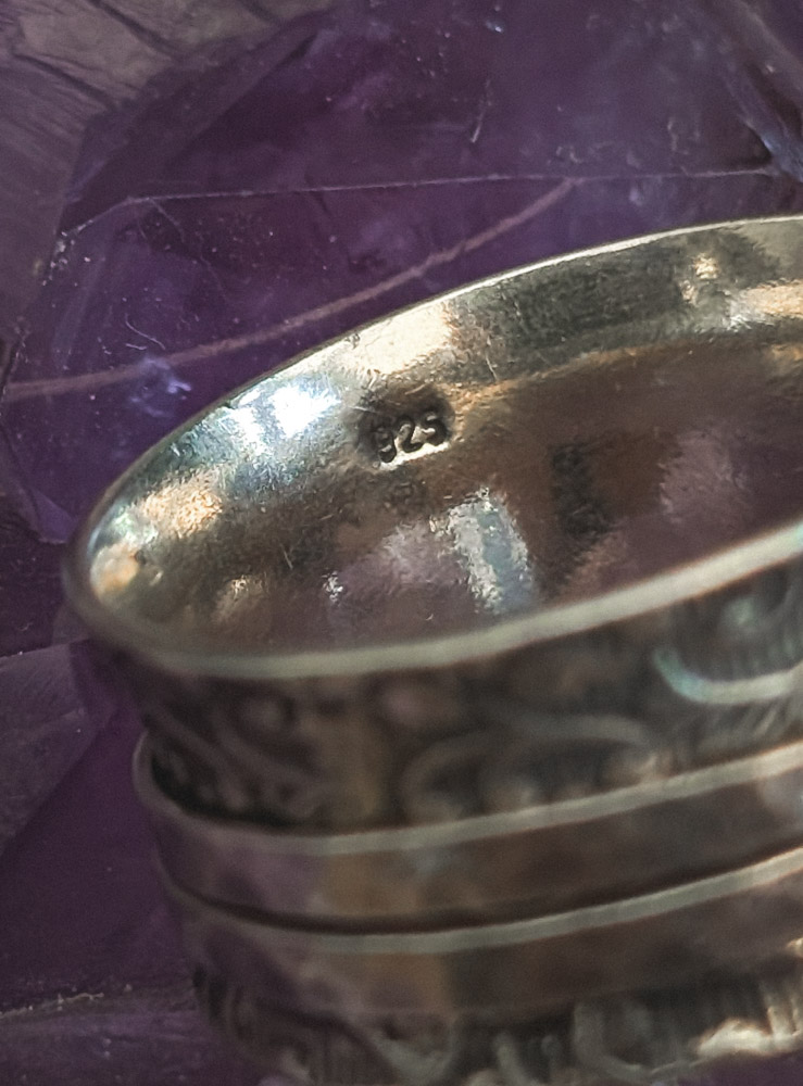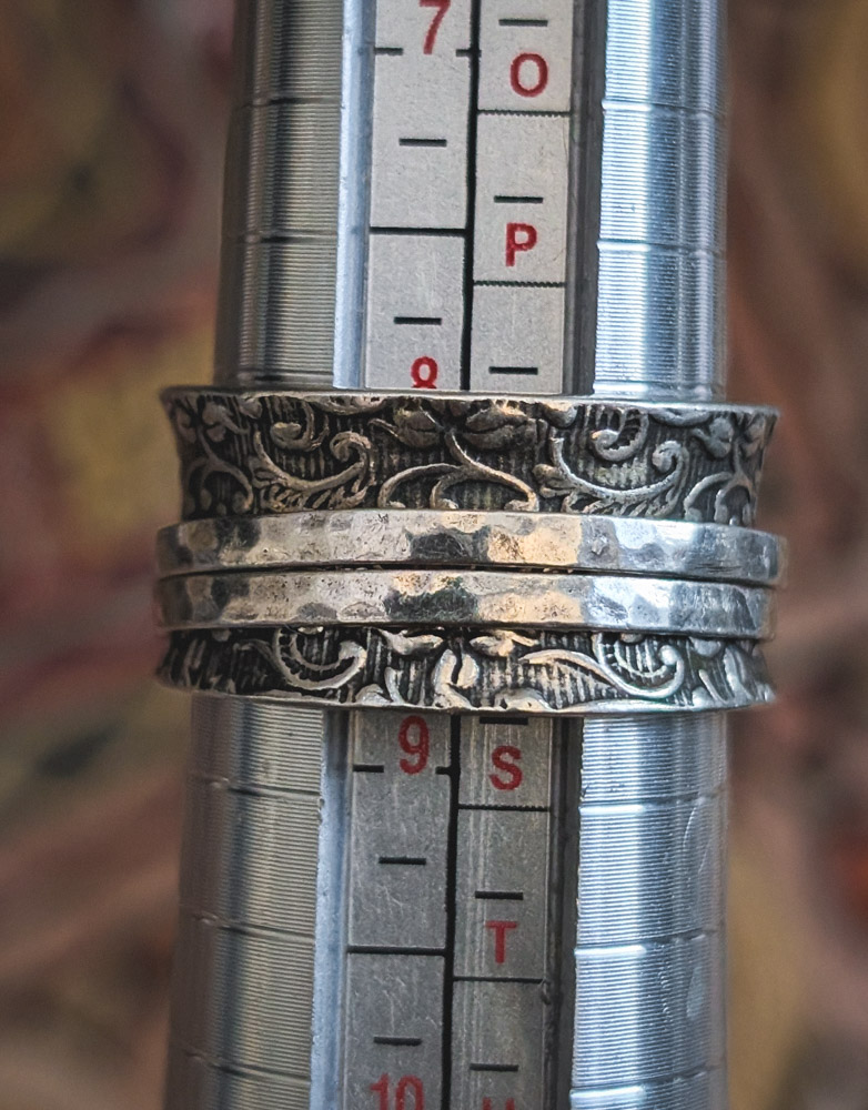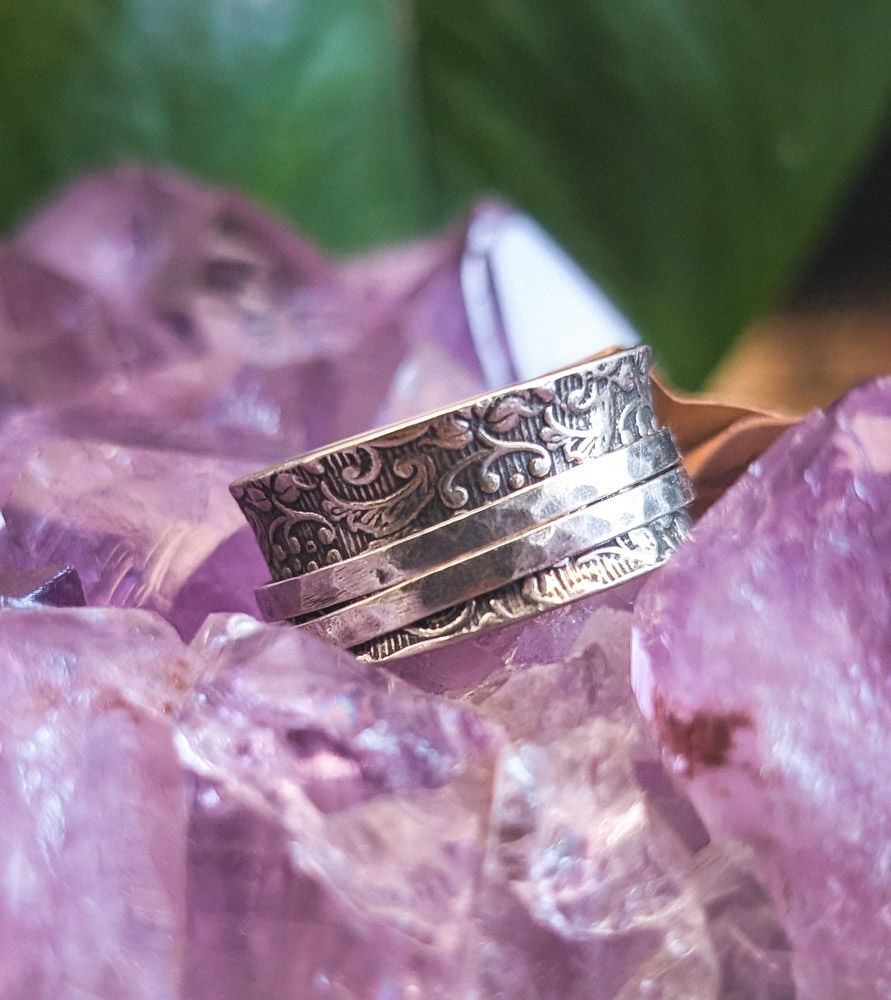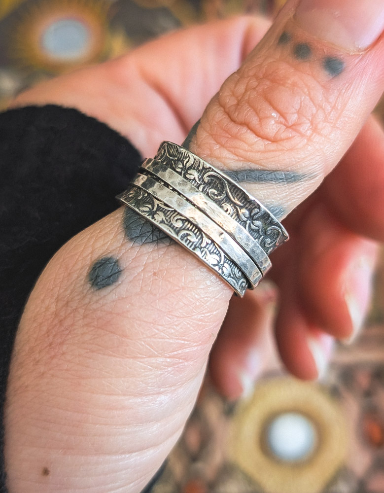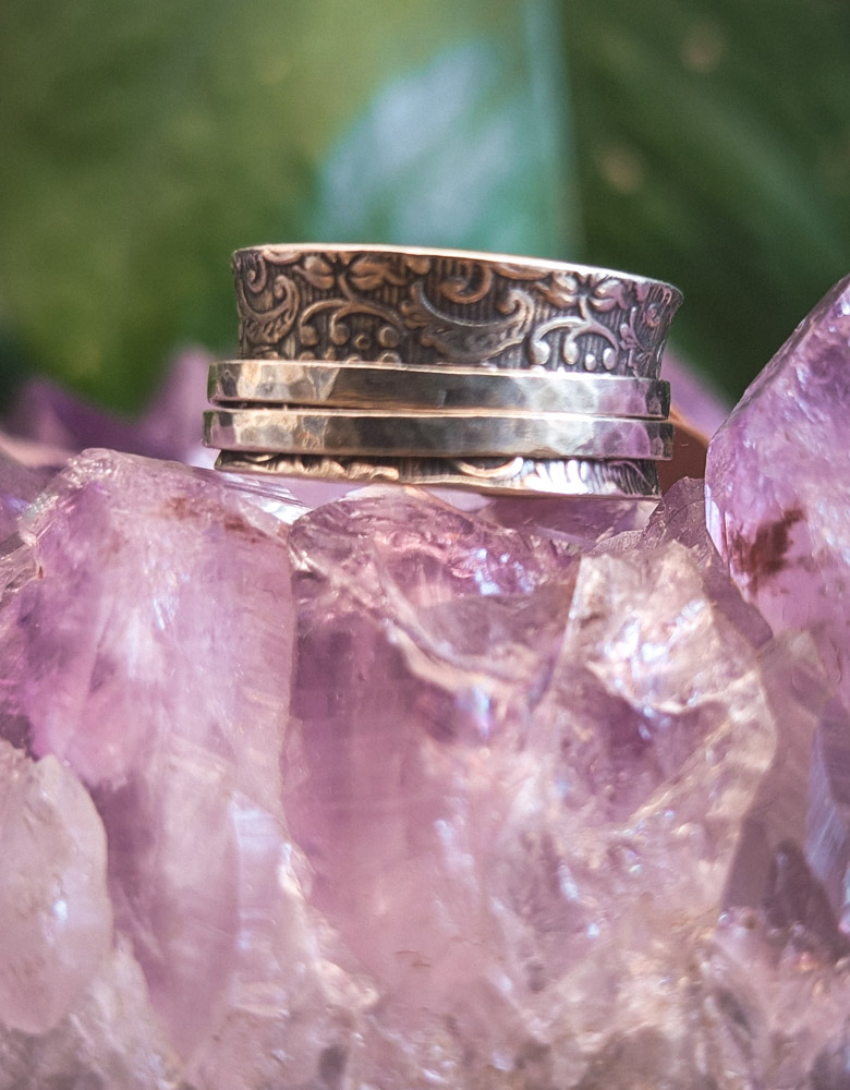 Funky spinner ring with a concave design, floral oxidised background with two thin hammered spinning bands.