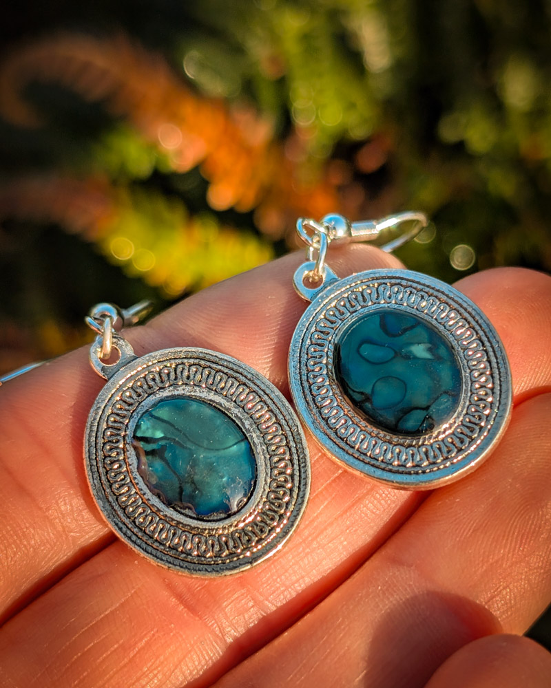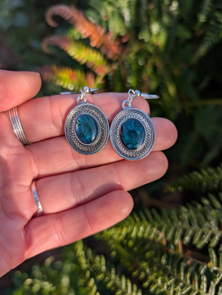 Simple witchy boho earrings. Oval shaped with a bali detail and centrepiece of a shiny colourful enamel shimmering green, blue and purple. Set on silver plated hooks. These are really lightweight and easy to wear.