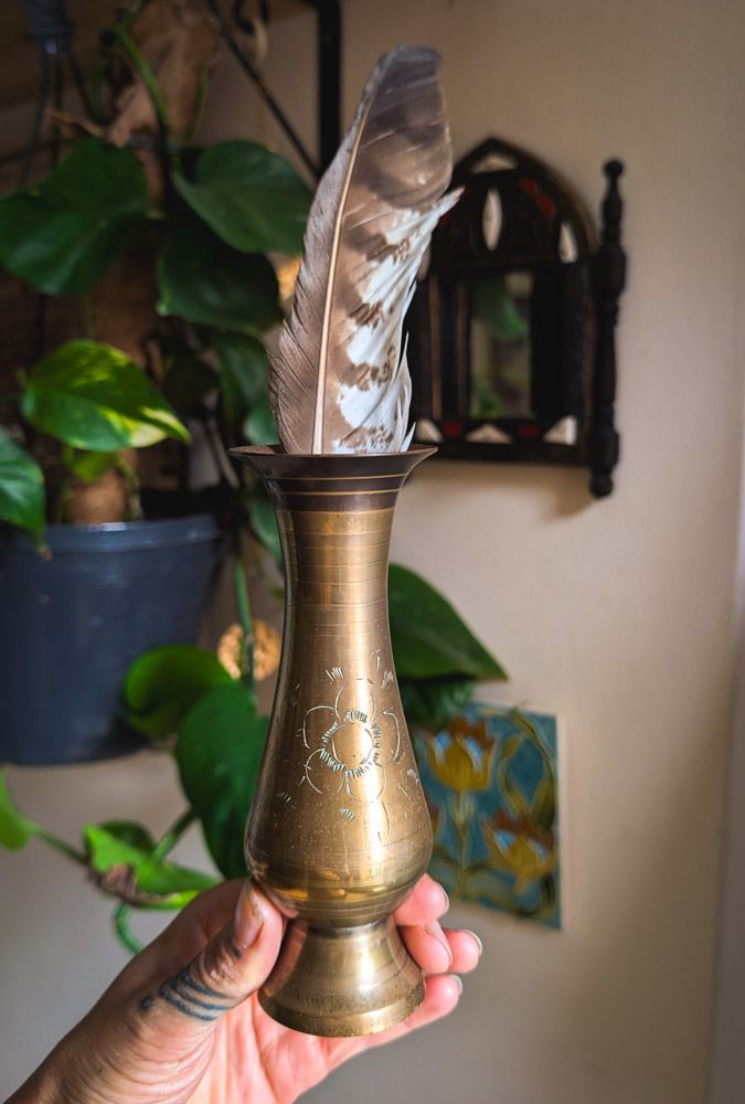 Seductively shaped brass vase with delicate floral etchings. Perfect for feathers + trinkets. Some patina on the inside as to be expected with such an old piece.