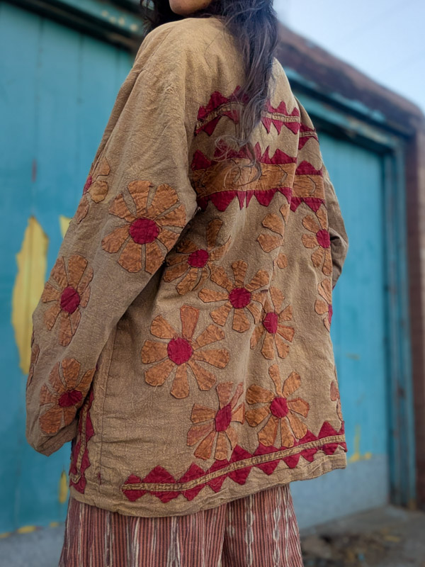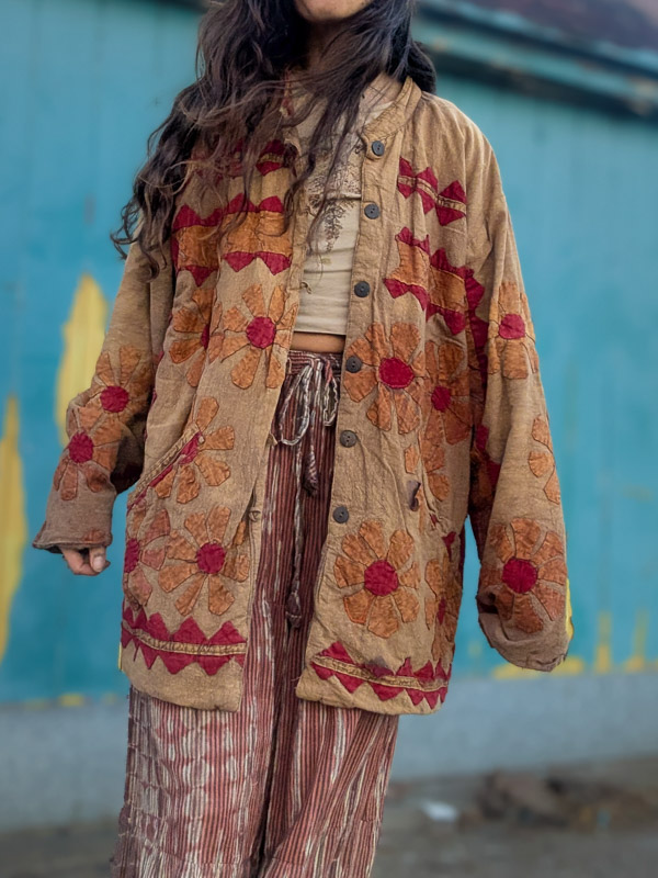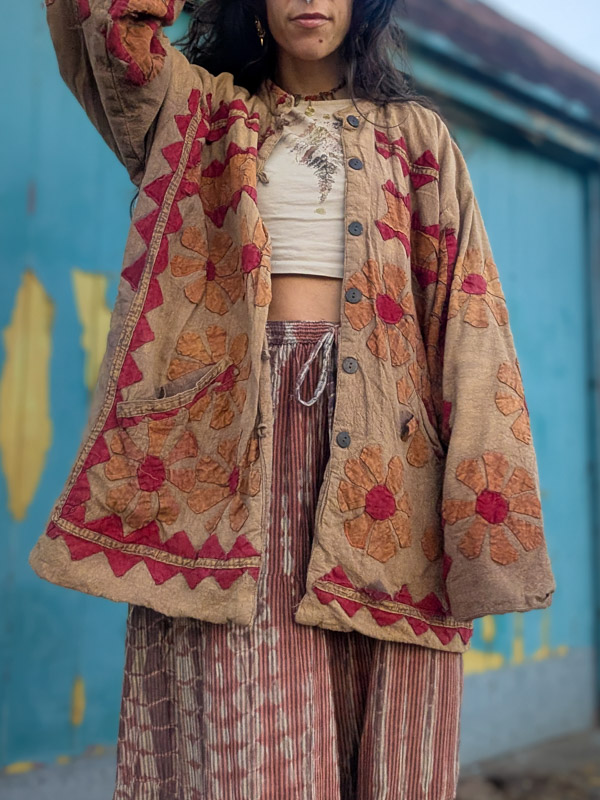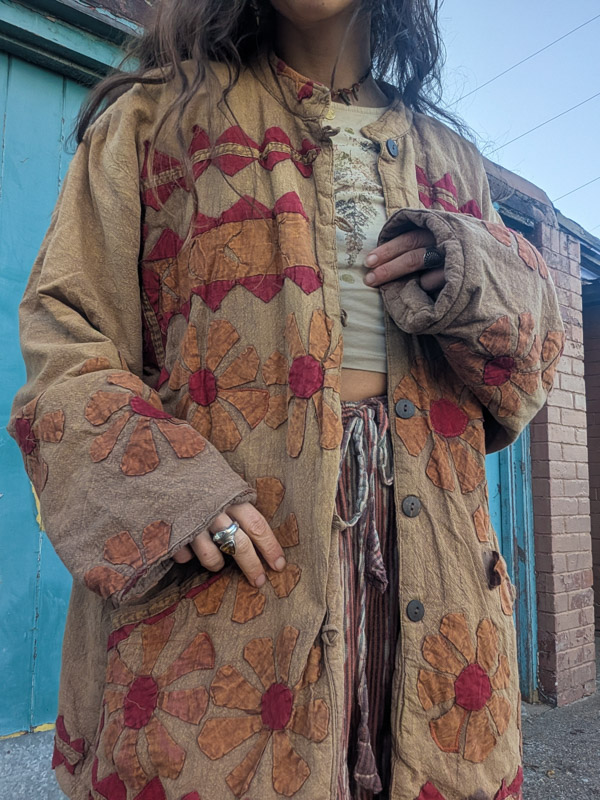 What an incredible piece! A quilted, thick jacket made from a soft, stonewashed brown cotton with appliqué flowers all over. This came to us in a bad state with lots of the patches needing restitching, so we’ve done our bet to restore it though there still may be some bits which are worn. There may still be slight signs of wear though. Buttons up with wooden buttons and has front pockets. Made in India in the 90s, these are highly sought after and you can see why. The fit is relaxed and roomy.