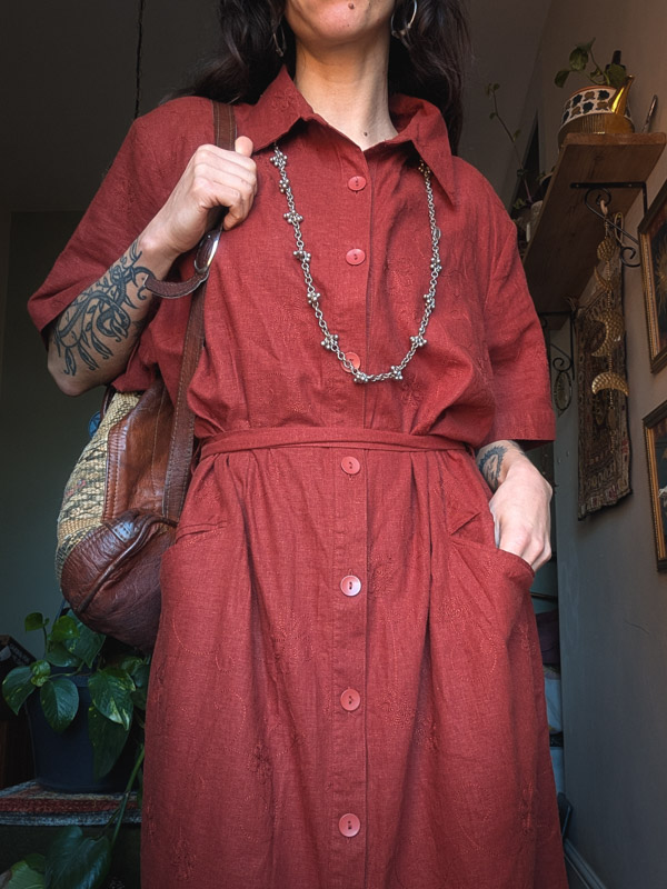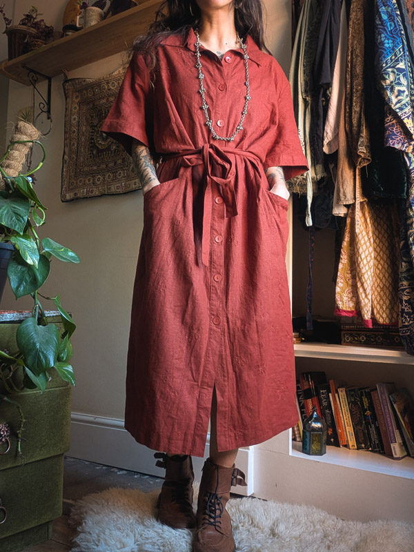 Midi dress in a gorgeous earthy red. Button up with a matching fabric belt and USEFUL pockets (always a deal-breaker). Covered in subtle embroidery which just gives this lovely mid-weight fabric even more texture. This does have shoulder pads too though they could be easily removed.