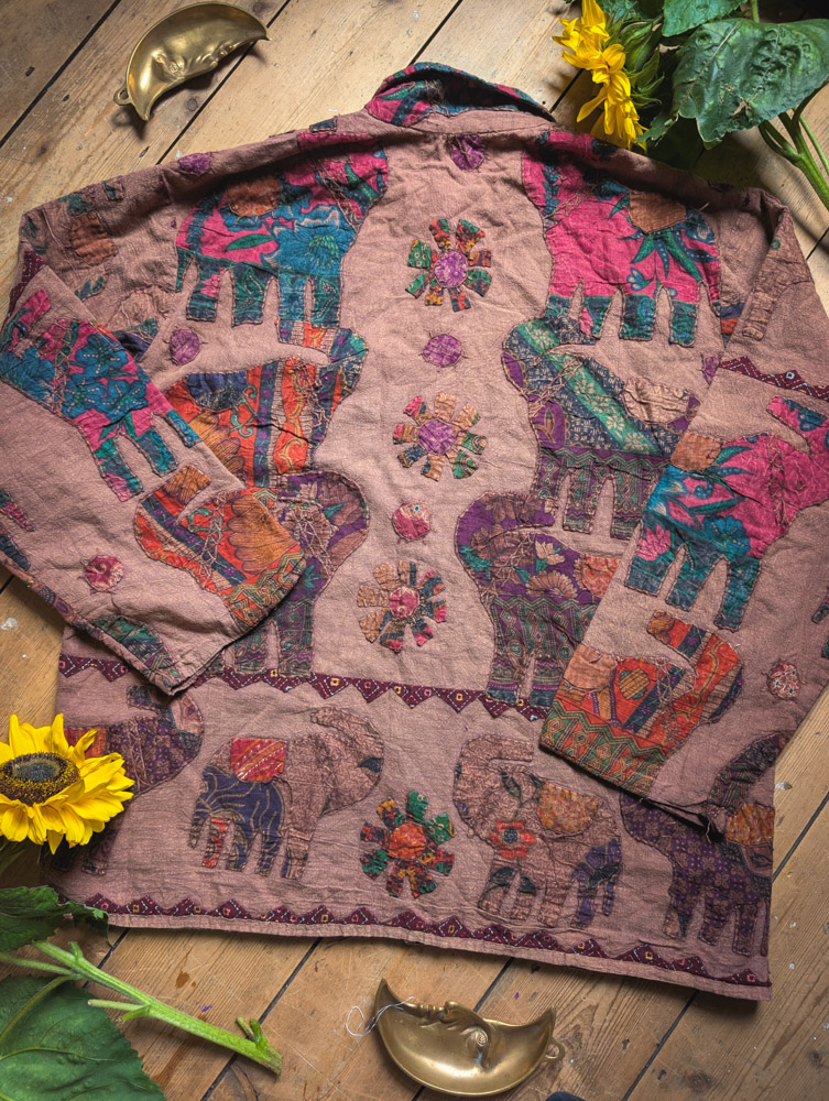 What an incredible piece! Patchwork jacket fully decorated with patterned elephants in fun batik prints, finished with hand stitching. The base colour is a soft stonewashed earthy brown with muted tones of green and burgundy. Made in India in the 90s, these are highly sought after and you can see why. Buttons up the front with two front pockets. The fit is relaxed and roomy.