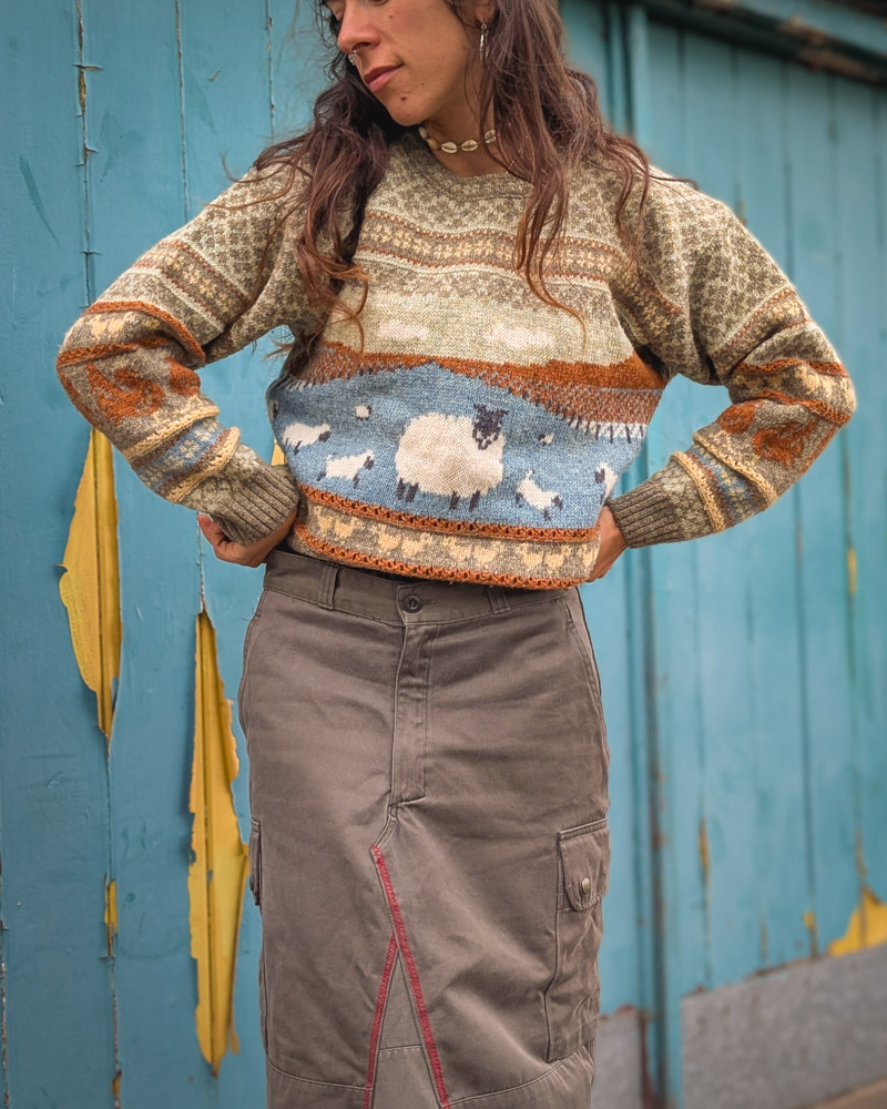 A quirky and adorable vintage jumper. Made in Scotland many moons ago it features sheep, ducks, chickens and fairisle style patterns. Unisex fit with a rounded neckline, relaxed fit in the body and full length sleeves.