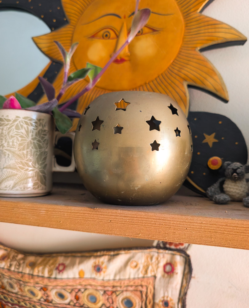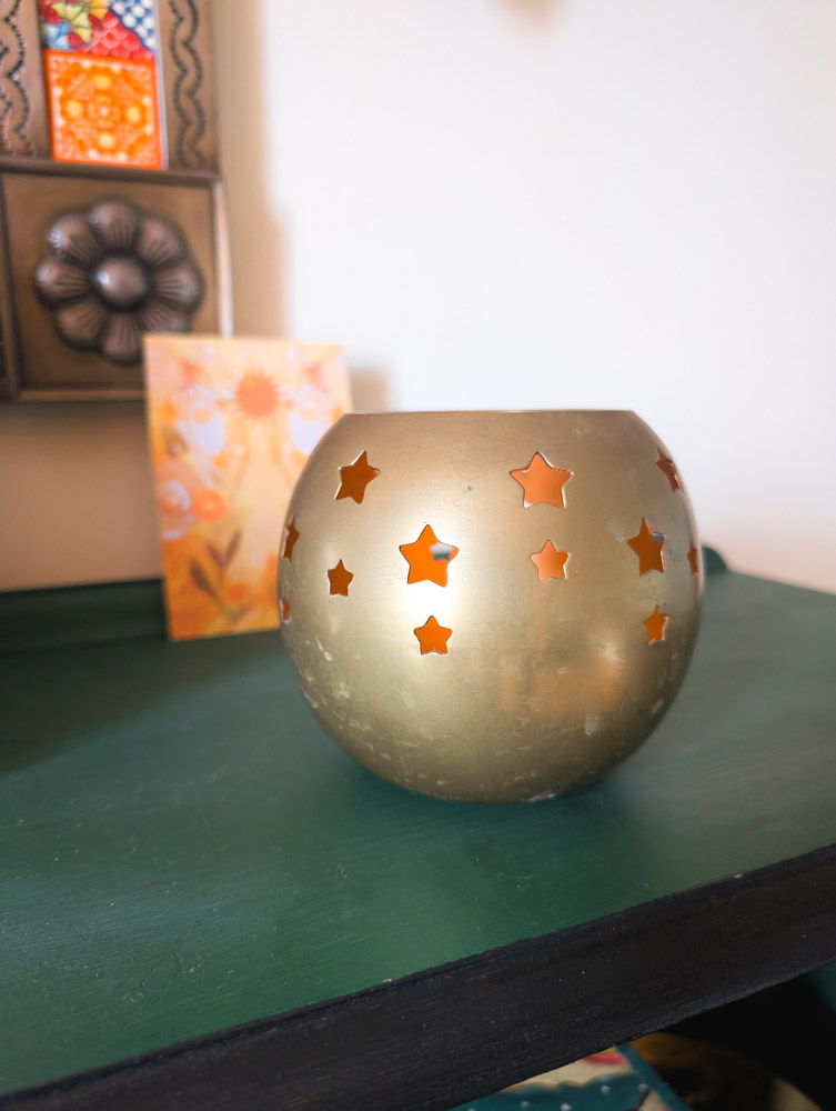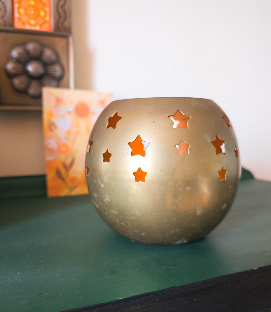 Large brass tealight holder with star cut-outs, perfect for adding whimsy to your home.