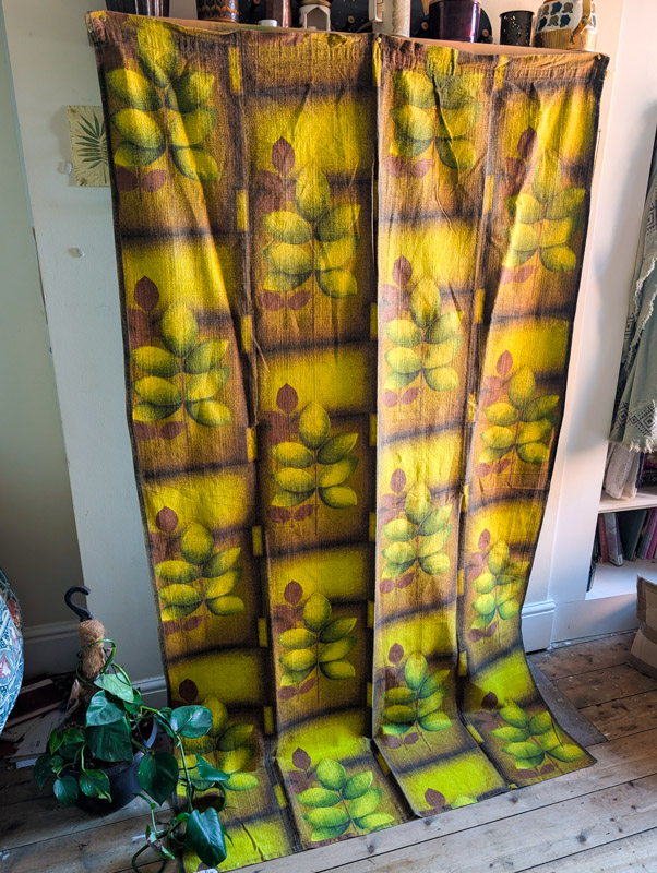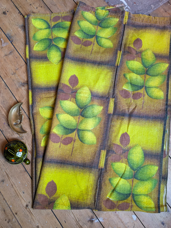 Incredible barkcloth fabric, most likely dating from the 50s/60s. Earthy tones of brown and green with contrasting lime green and a large, repeating leaf print. Barkcloth has a wonderful texture to it, it’s one of our favourite fabrics for its durability and quality. Curtain hooks + rings will be needed to hang these or they could be hemmed to go through a pole. We have 6 available, price is per curtain.