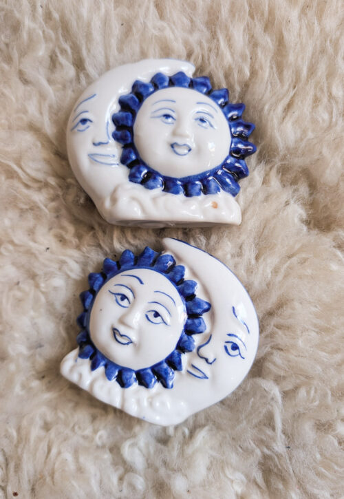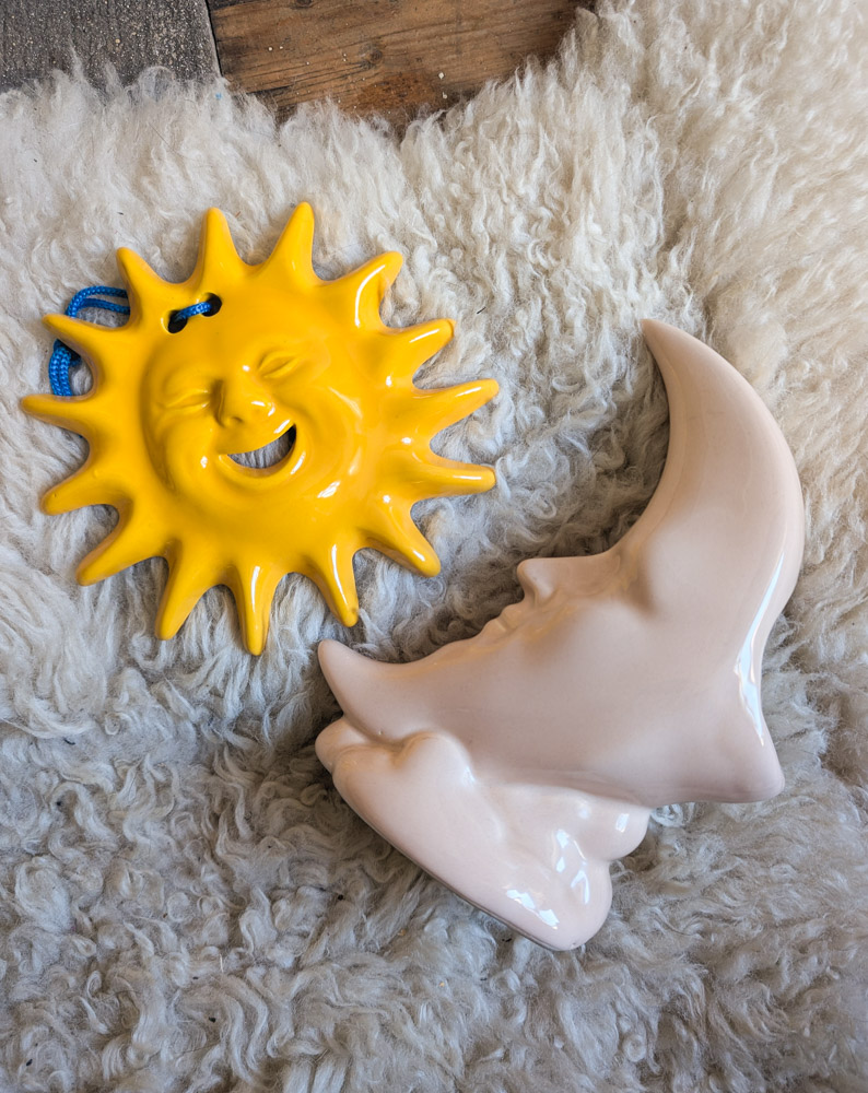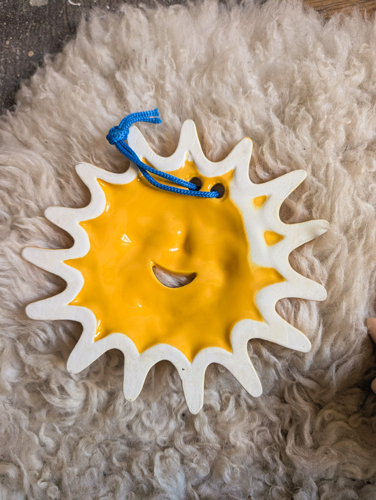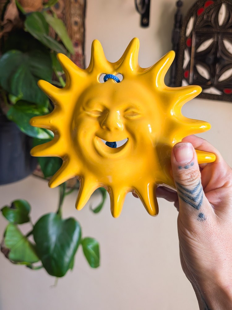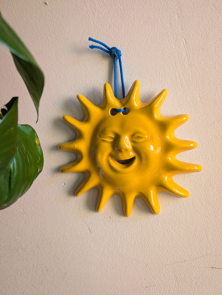The happiest yellow ceramic sun, which we believe is Italian or Spanish-made and honestly reminds us of the Tellietubbies baby (so 90s)! Hangs from a blue rope. In lovely condition.