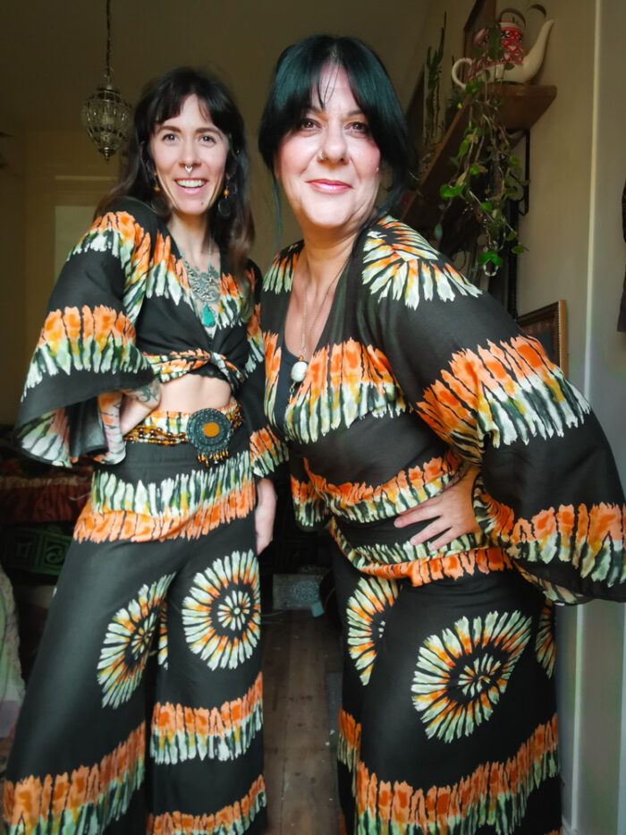 One piece, so many ways to wear. We love how versatile our wrap tops are. With flattering 3/4 length flared sleeves and a cropped fit, these look gorgeous wrapped over, tied in the middle, or even worn under dungarees. A deep olive green with an earthy tie dye print. These are light rayon, ideal to wear all year round with a little clever layering. Add bold prints for a hippie bohemian look or add plain palazzo trousers for a yoga girl look.
